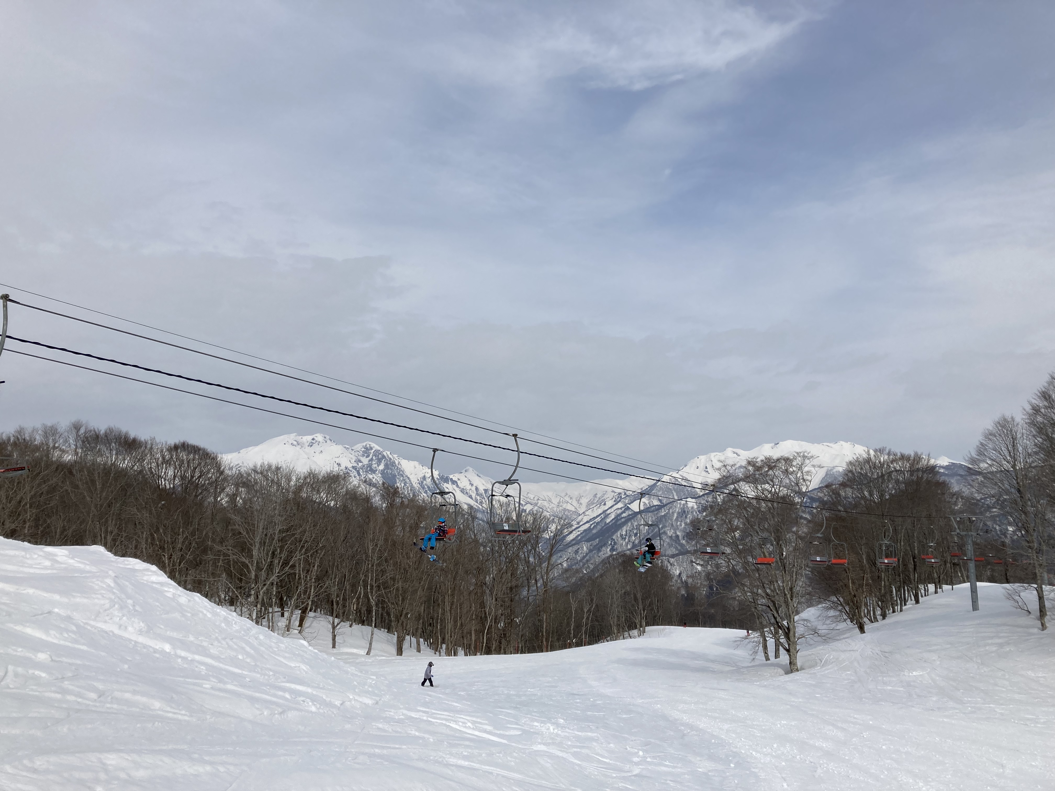 残念ながら曇り空。ベースのゲレンデでもまだまだ雪たっぷり。