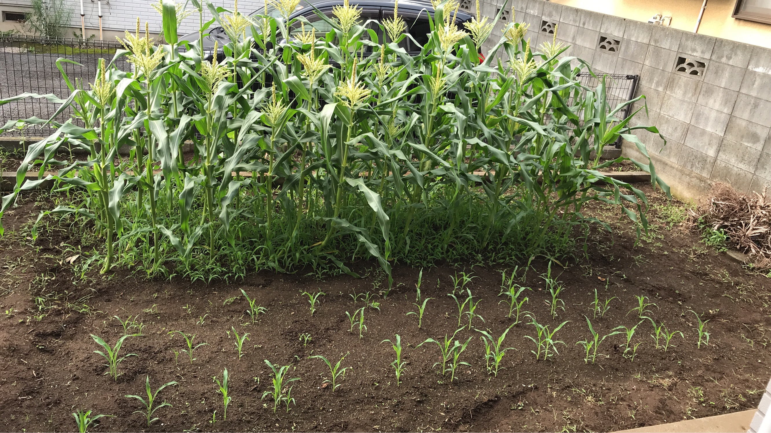 手前には2回目のトウモロコシがあります。今日で3週間ちょっと経ちました。こちらもなかなかいい感じですねっ。