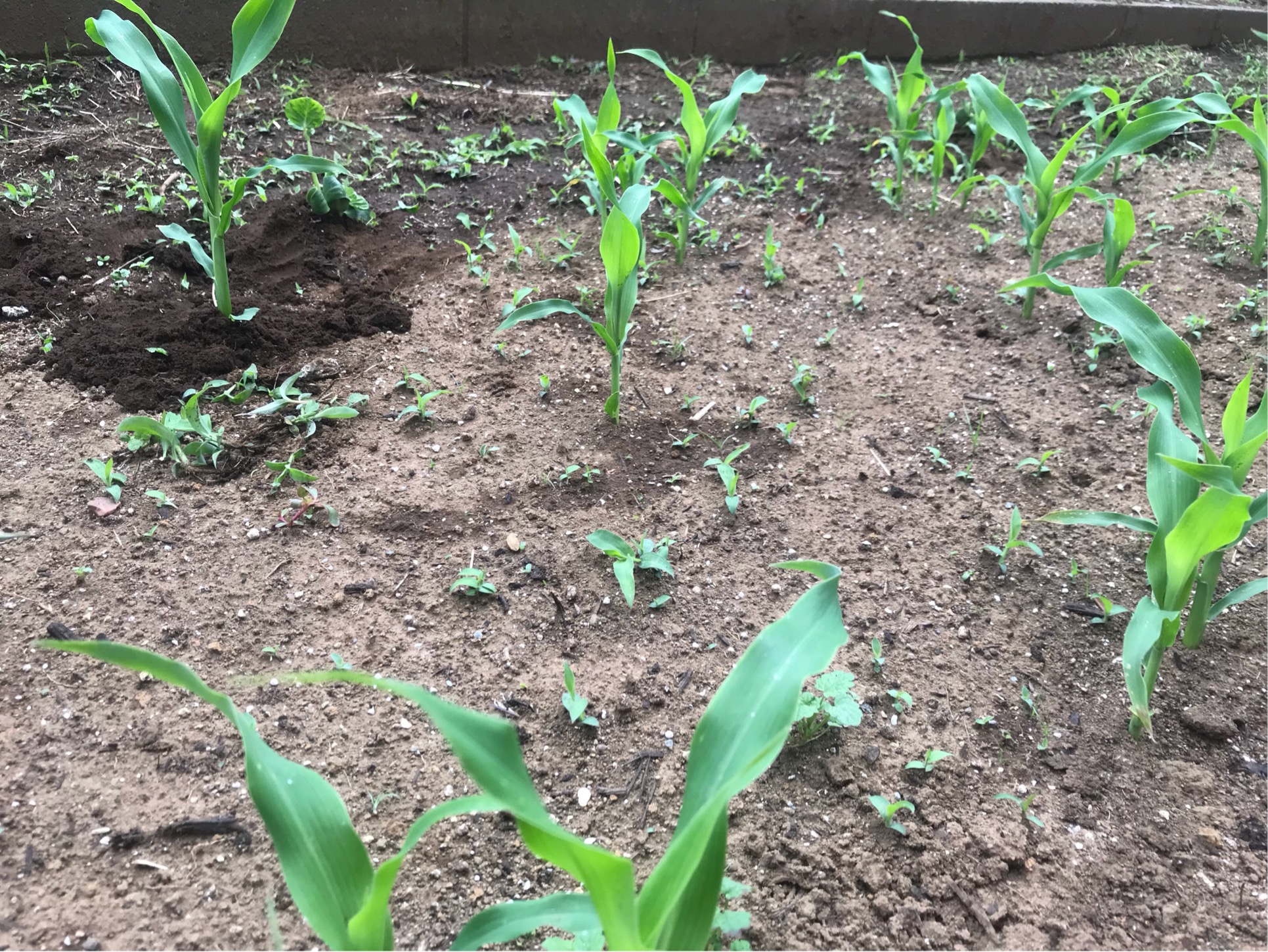 トウモロコシはなかなか良い感じです。種を蒔いてから24日目で、大きい株は15㎝を超えています。この後は成長が早まる時期になります。最近は雨ばかりですが、週明けからは天気が良さそうですので、グングン大きくなってもらいたいです。