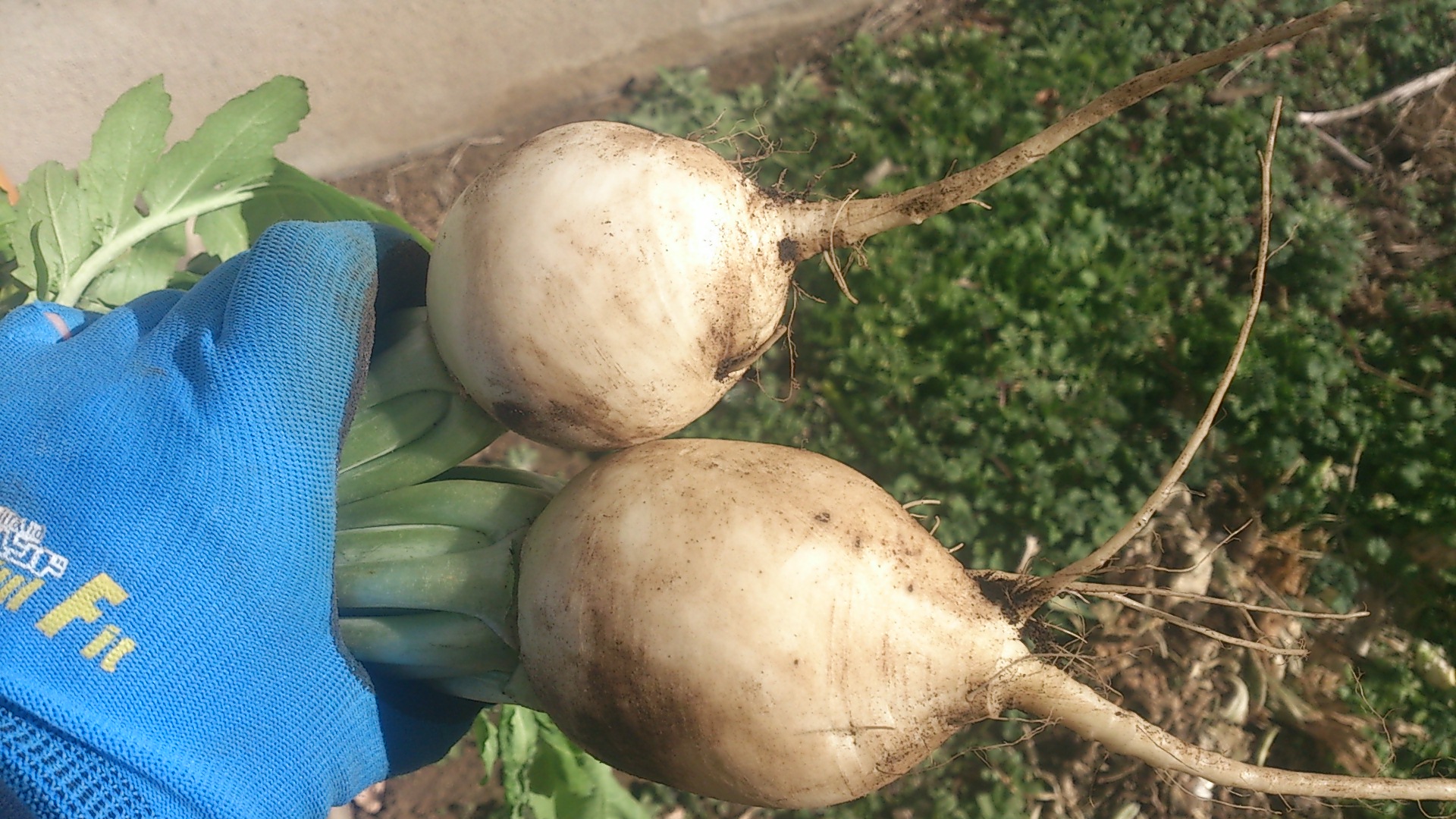 先週は小カブを撤収しました。忘れかけていた聖護院大根ですが、あまり肥大しません。じっくり育てるようですが、種まきからもう3カ月半たってしまいました。そこで、小振りなものを抜いてみました。