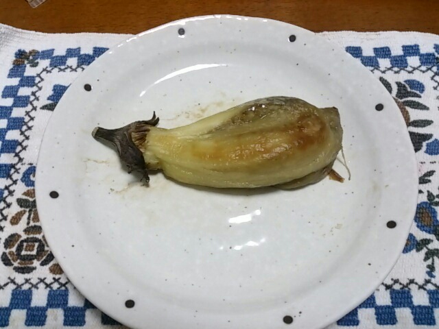 会社のオジサンからもらった茄子が1本残っていたので、丸ごと網焼きにしてみました。夏野菜は美味い。