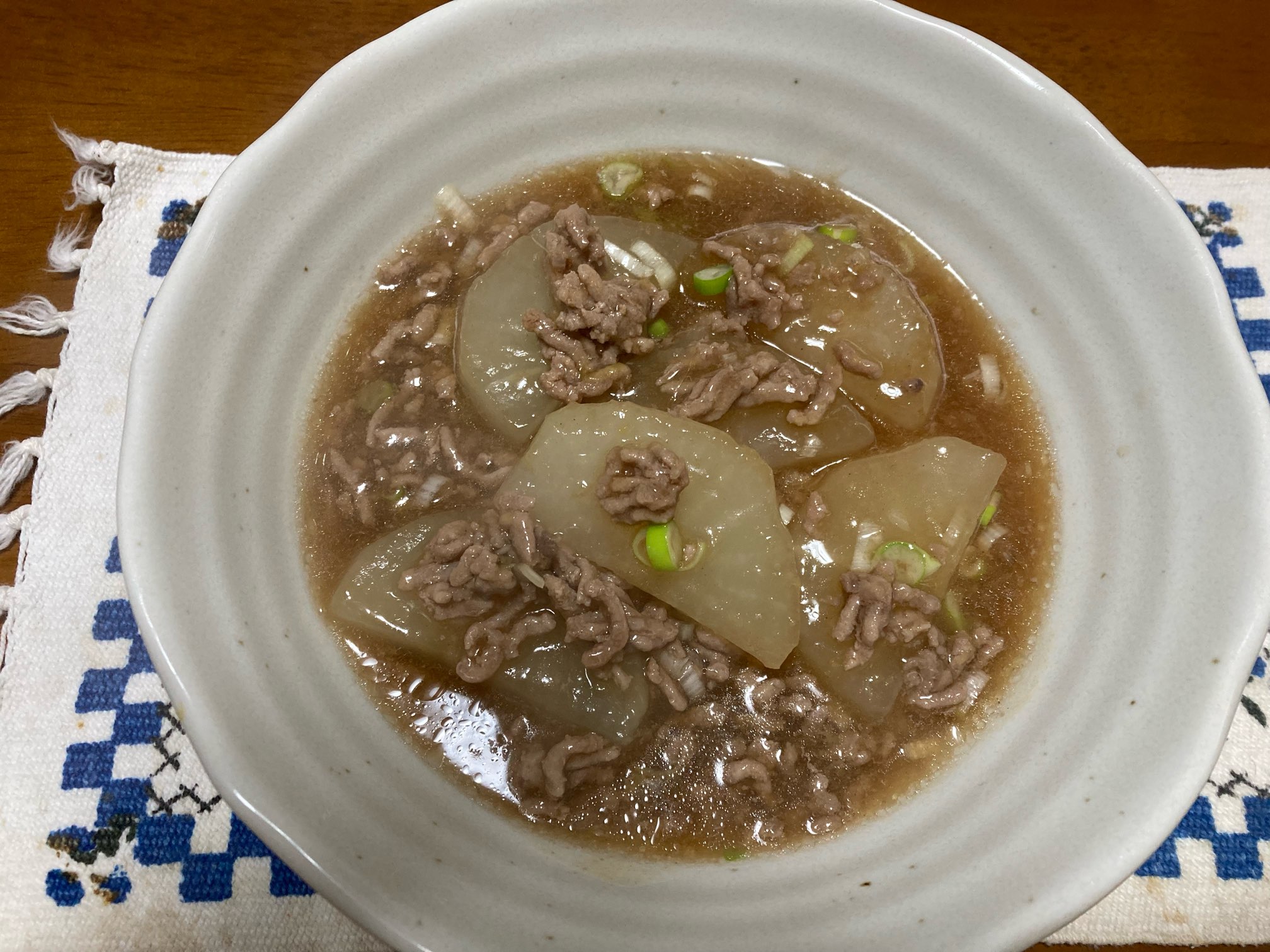 あまり物の挽肉と貰い物の大根を使って、大根そぼろ煮を作った。
