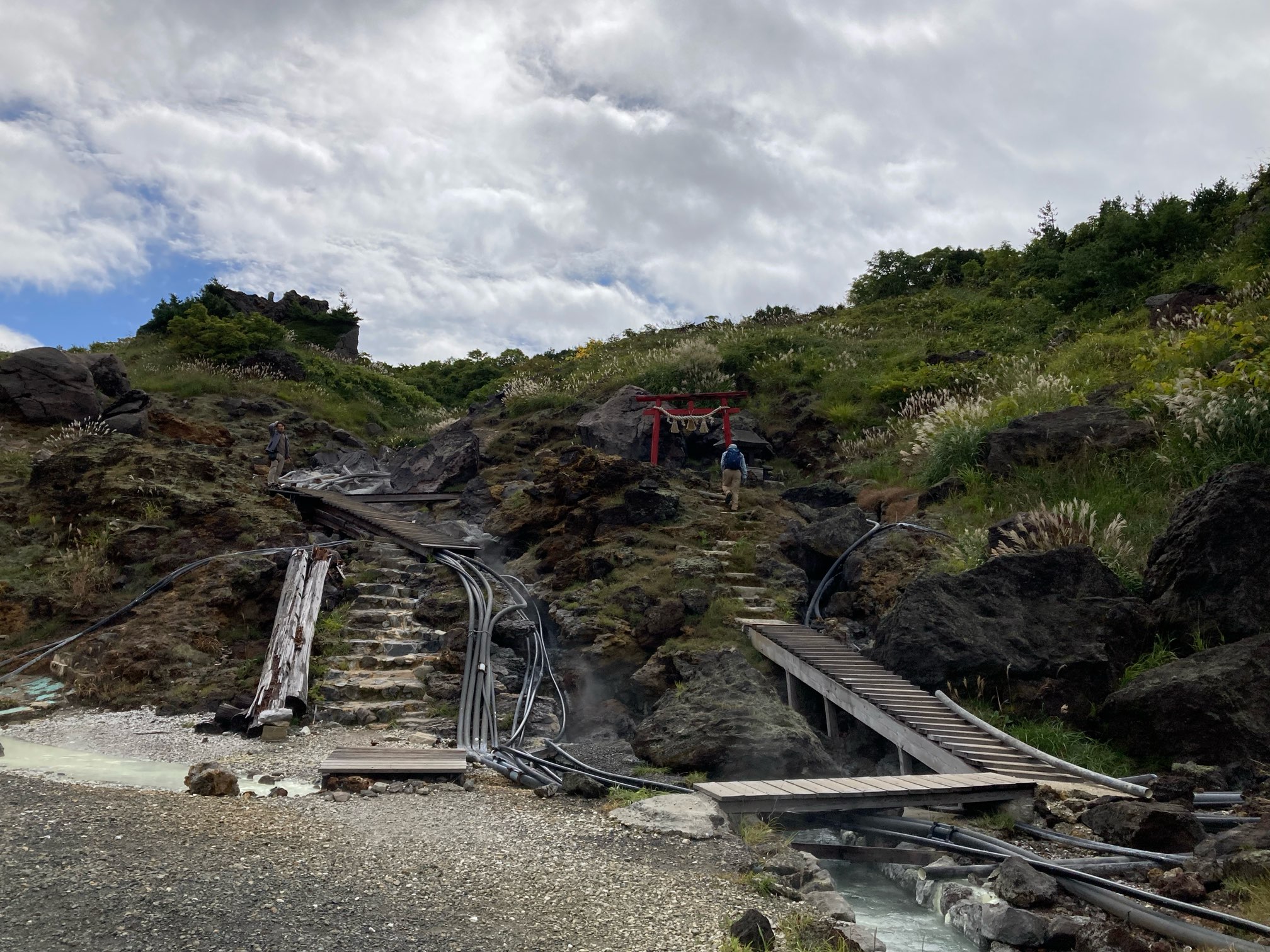 温泉神社の上を行くと栗駒山へ至る。ほんの少しだけ登ったところから宿を眺める。