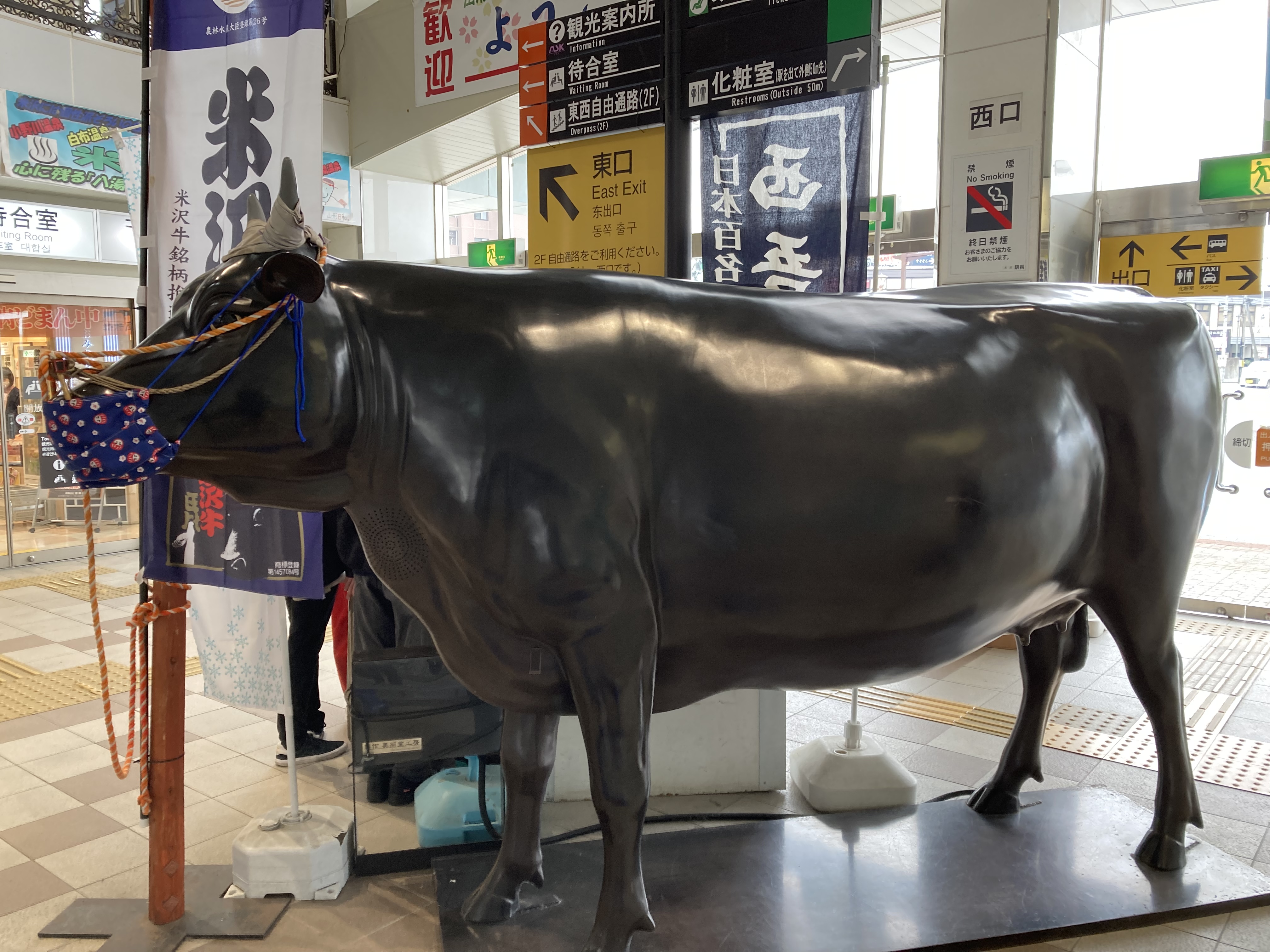 しばらく何処かで時間潰しということで、米沢駅まで車を走らせ米沢牛料理を食べることにした。