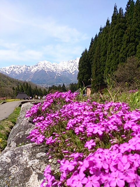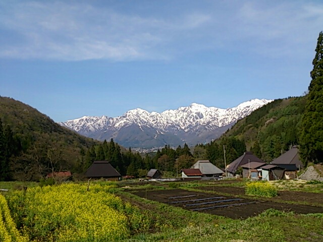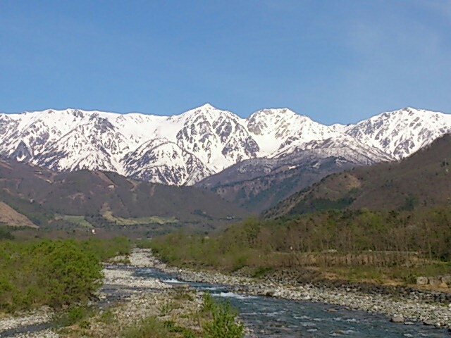 里山の新緑と残雪を纏った山のコントラストが素晴らしいです。