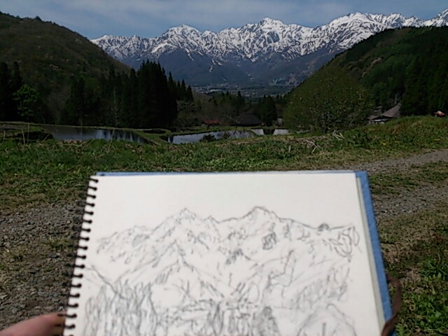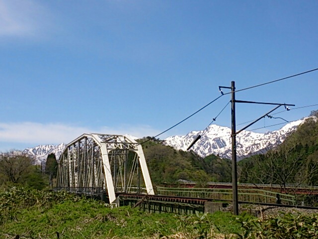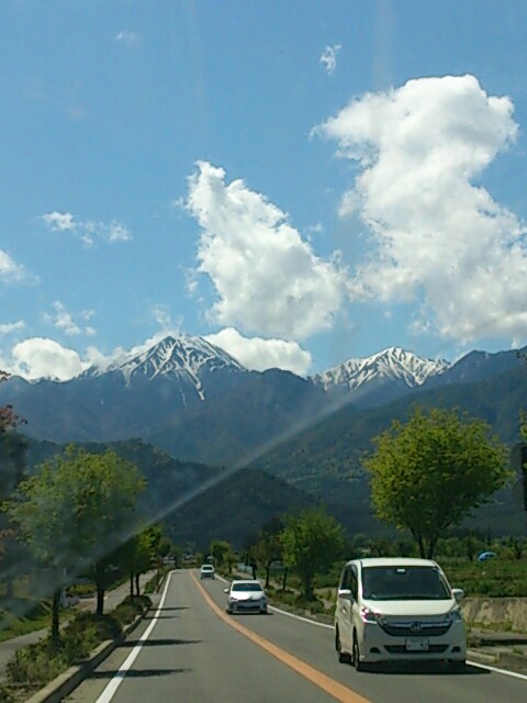 行きの途中です。残雪の白馬三山が輝いています。