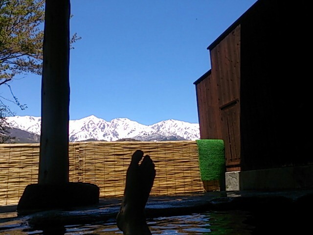 立ち寄り温泉しました。特別に私のプチヌード披露!。。。そんなことより露天風呂から白馬三山がバッチリの眺めで素晴らしい。