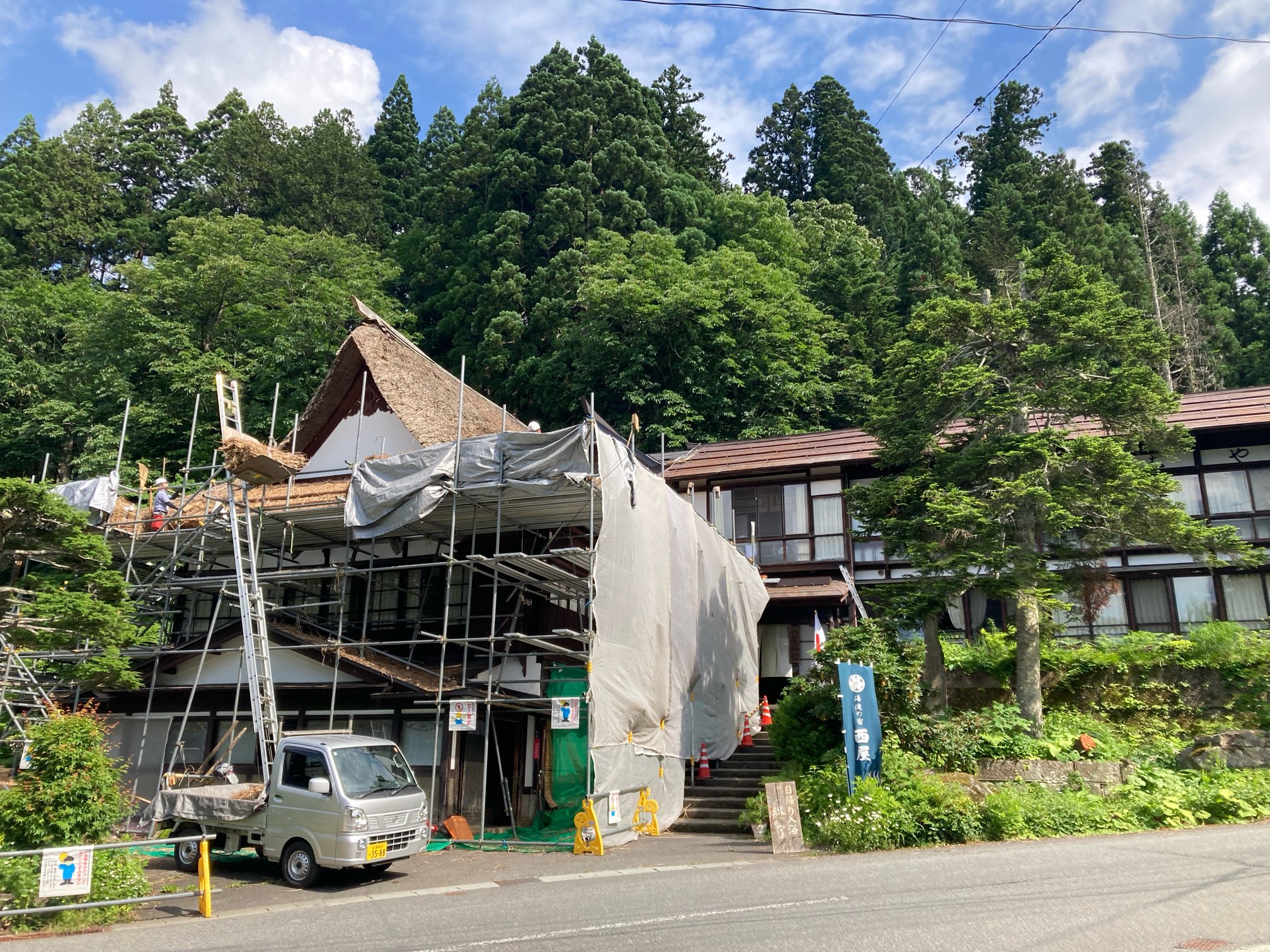 茅葺の修復作業が行われていた。今どきこんなの見られるのも貴重であろう。