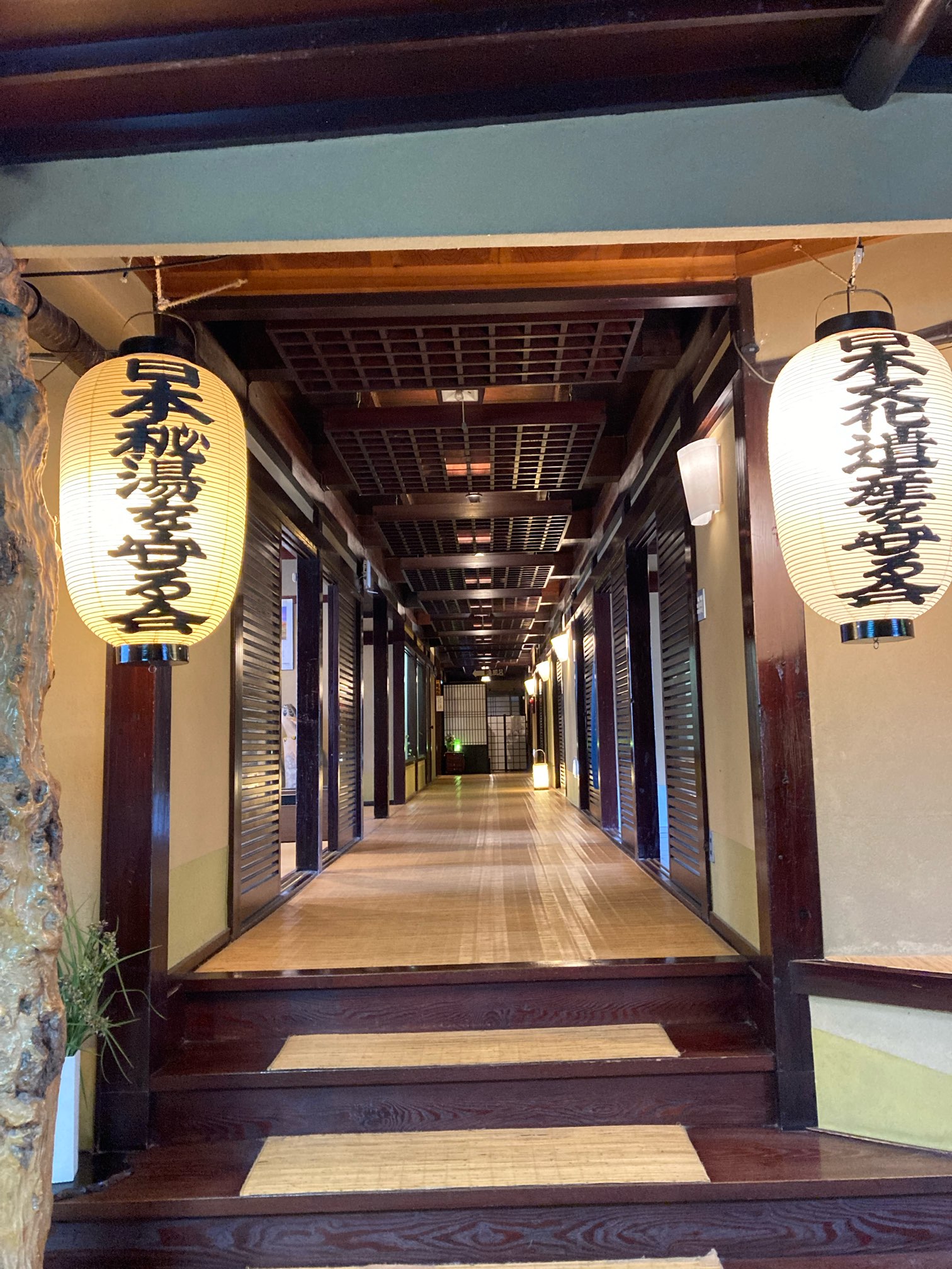 風呂前の渡り廊下では足元に湯が流れている。