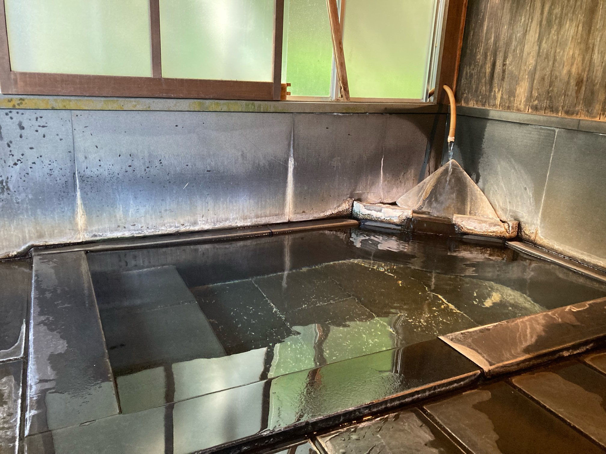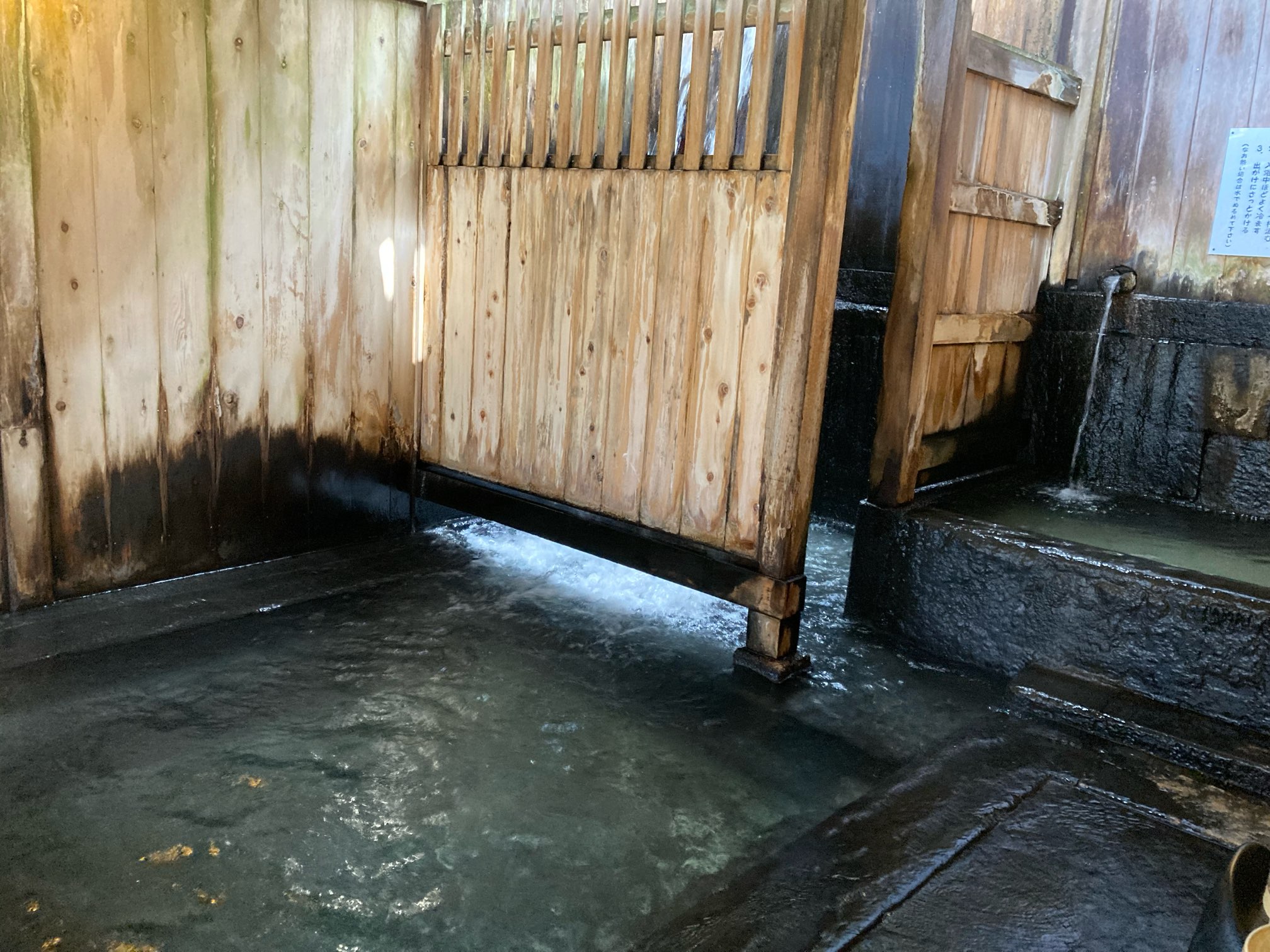 300年以上前からある湯船。もちろん白布温泉最古のもの。湯量が半端でなく、ドバドバと注がれている。