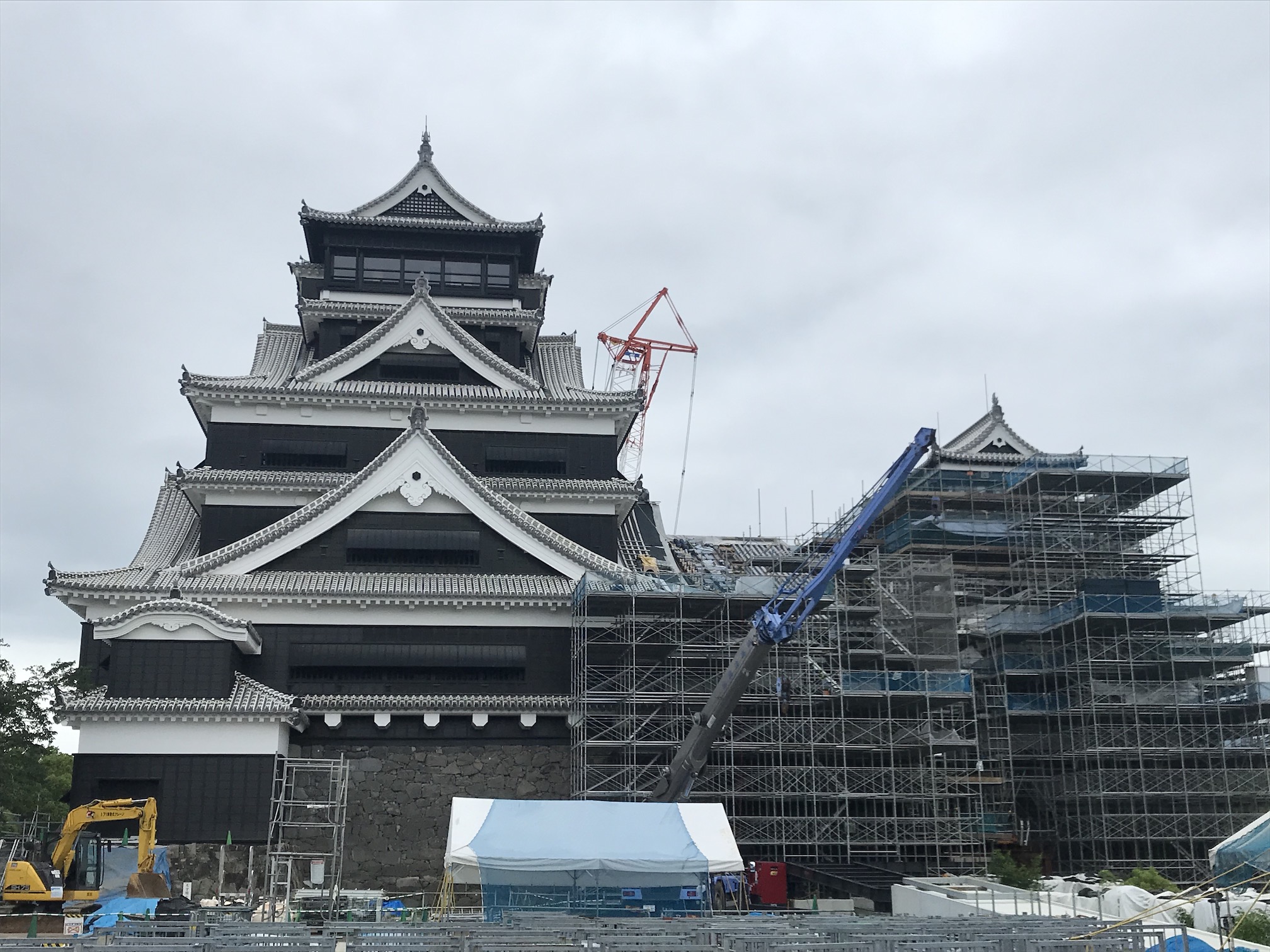 復興作業中。先の熊本地震の爪跡がそこらじゅうに見られる。