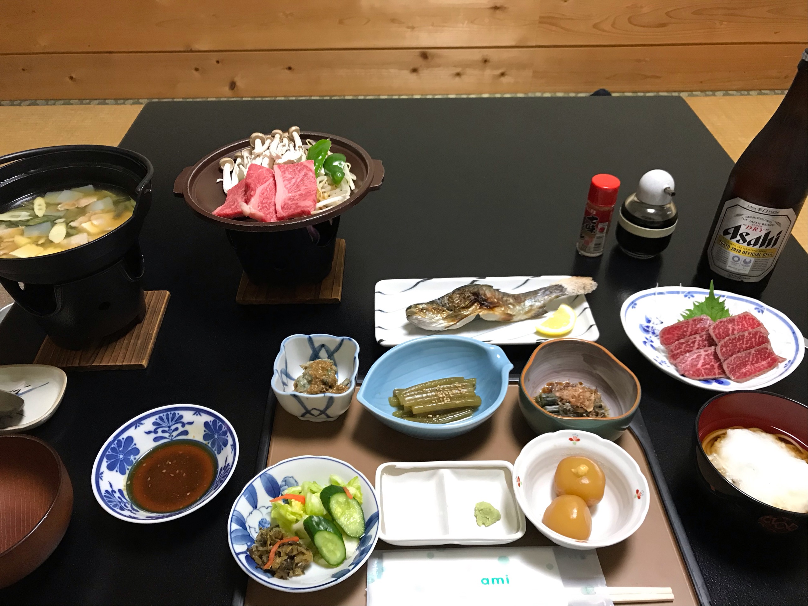 夕食。おまけの米沢牛が美味い。