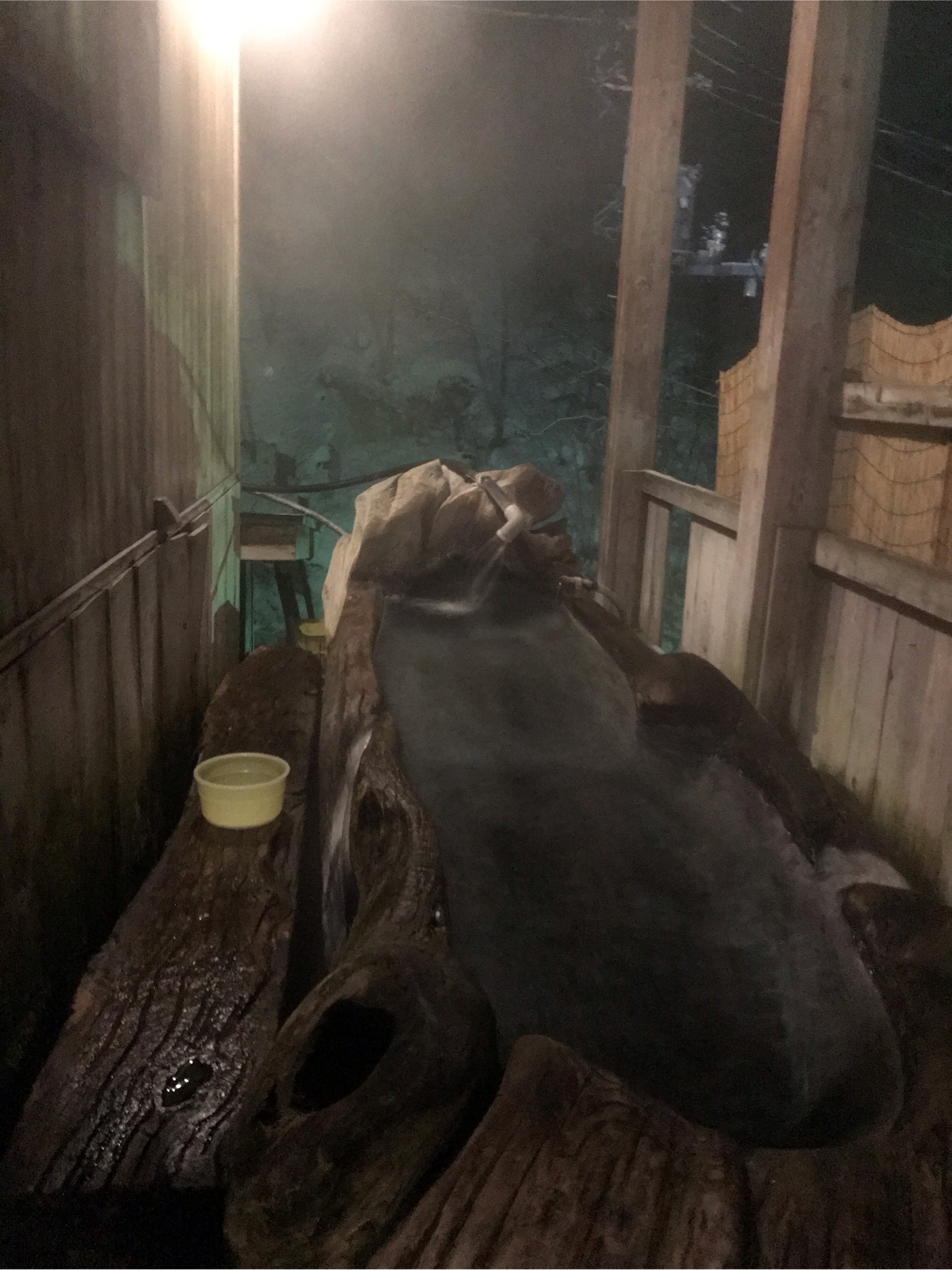 根っ子をくり抜いた半露天風呂はなかなかいい感じの湯加減だ。貸切りにできるので静かにのんびりが良い。雪も降っており風情を増す。
