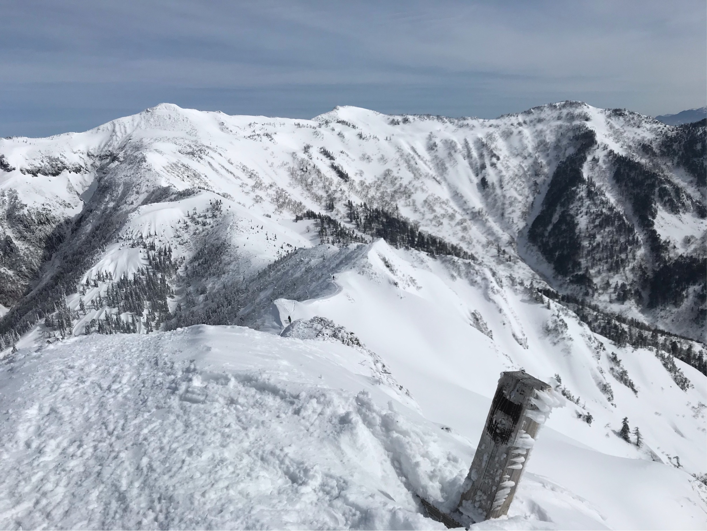 スキー場トップから歩き出す。初っ端の急登を越えると、目の前に剣ケ峰山が現れた。この山を越えて行く。