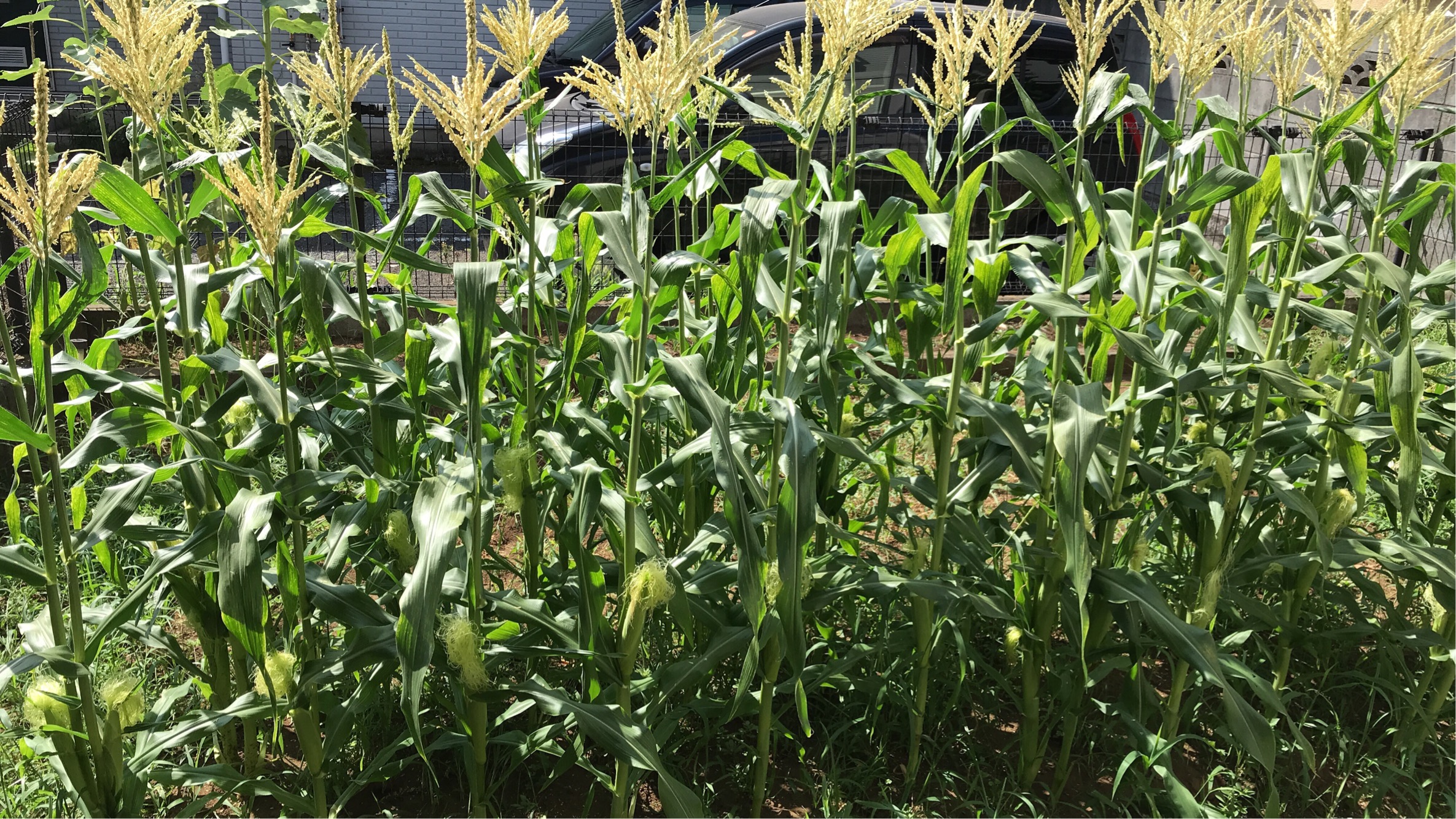 2回目のトウモロコシが種蒔きから2ケ月過ぎました。ほぼ全ての株に実が付いていますが、なんとなく小さいように感じます。
