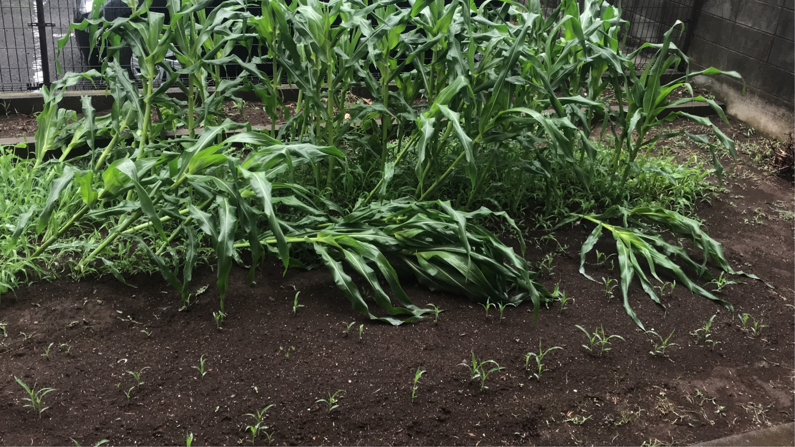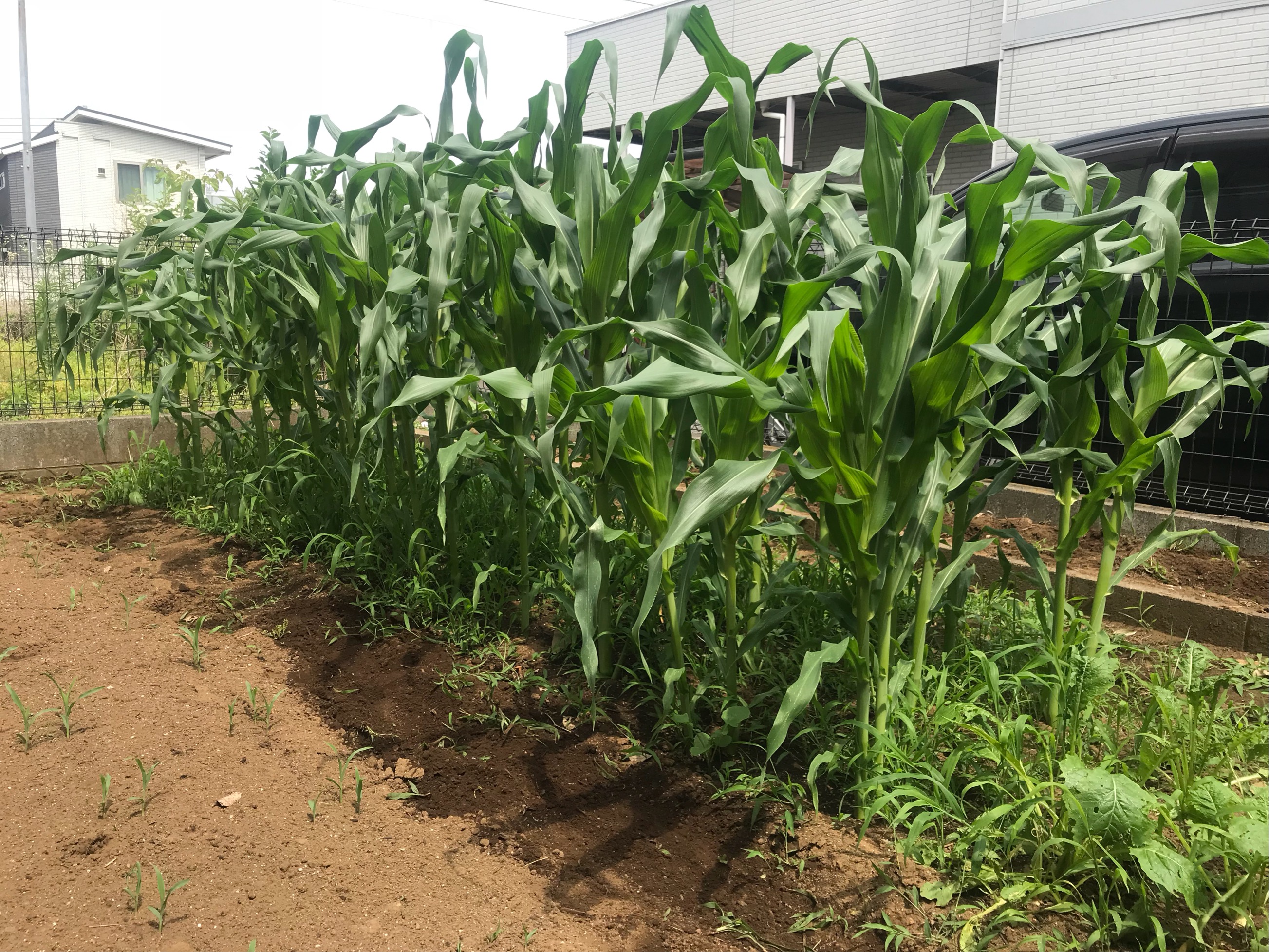 ちなみに、手前にチョビチョビ小さく生えているのは、2回目に蒔いたトウモロコシです。