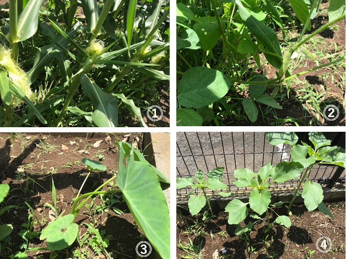 ③昨年に収穫した里芋の残りが、最近芽を出していました。着実に大きくなっているので、このまま育てます。