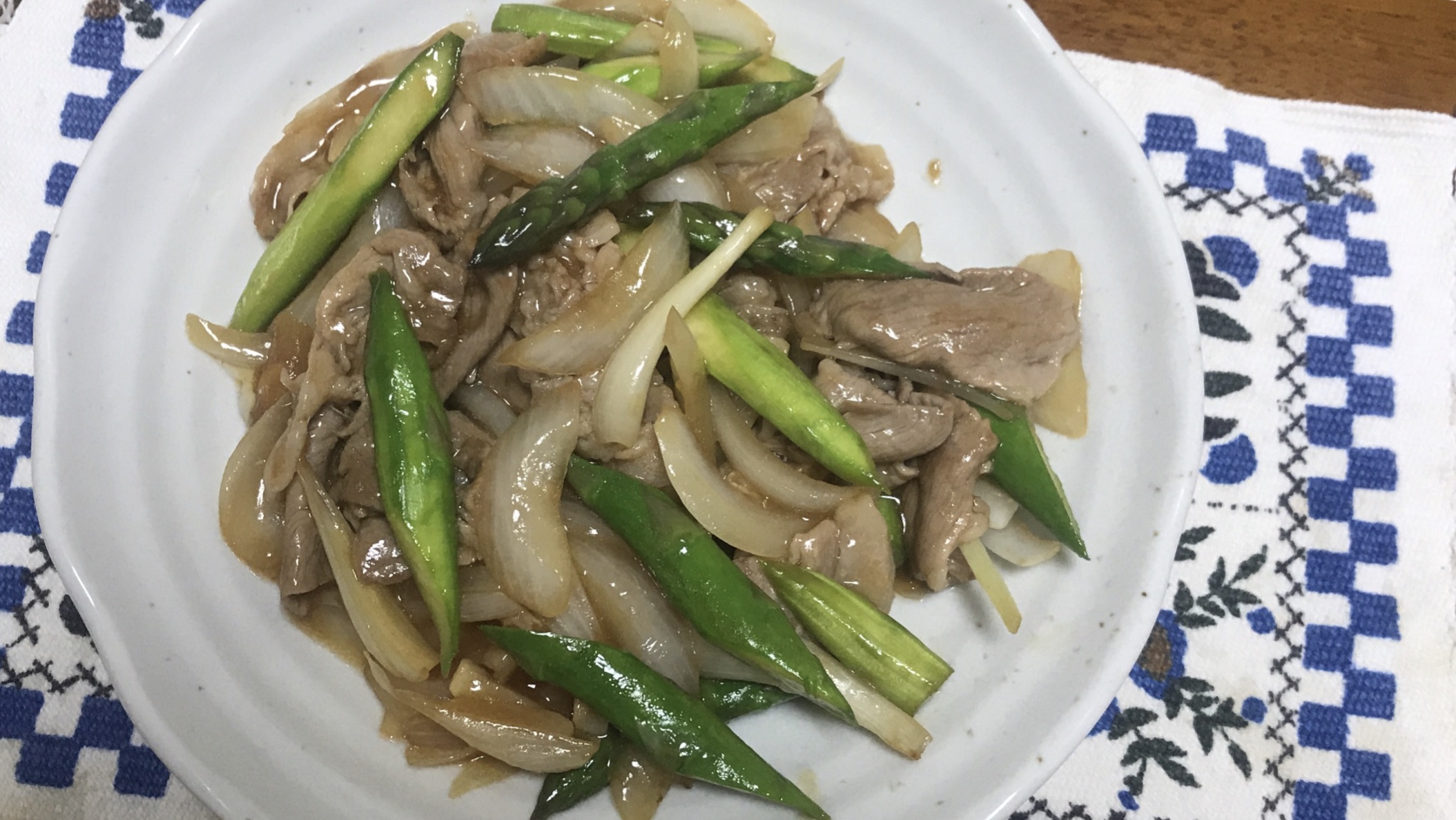 豚肉とアスパラとエシャロットのオイスターソース旨味炒めです。