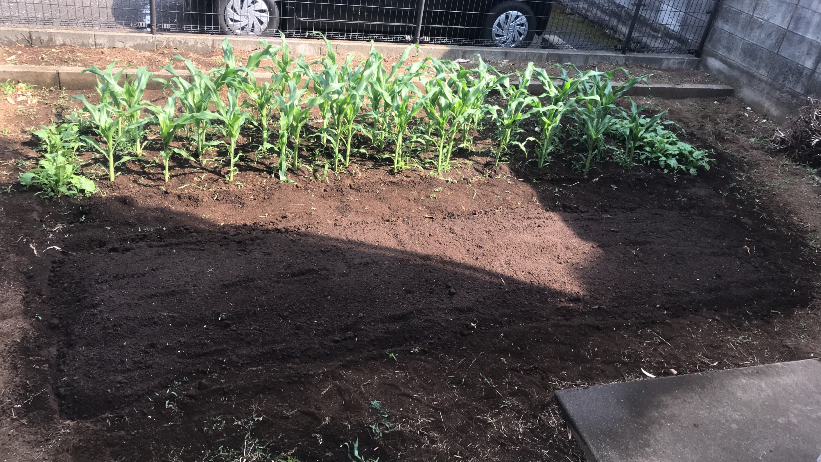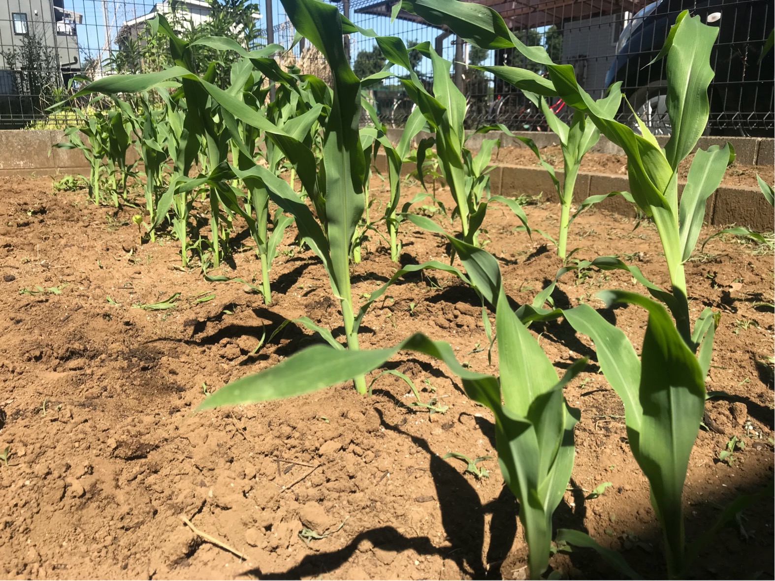 トウモロコシの様子です。種蒔きからちょうど1か月経ちました。大きいもので30cmくらいになりました。ここで間引きと追肥を行ないました。