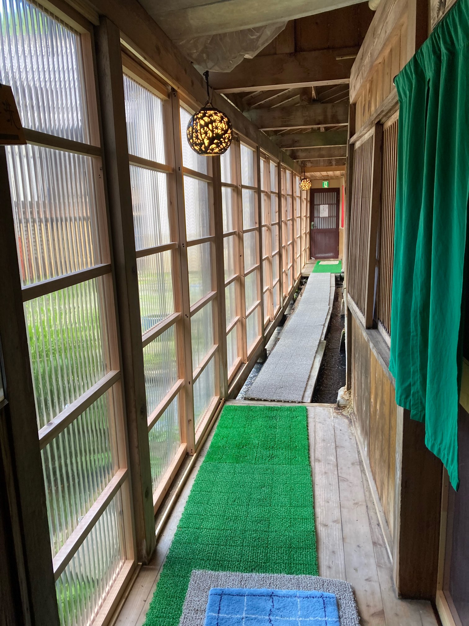風呂前の渡り廊下では足元に湯が流れている。