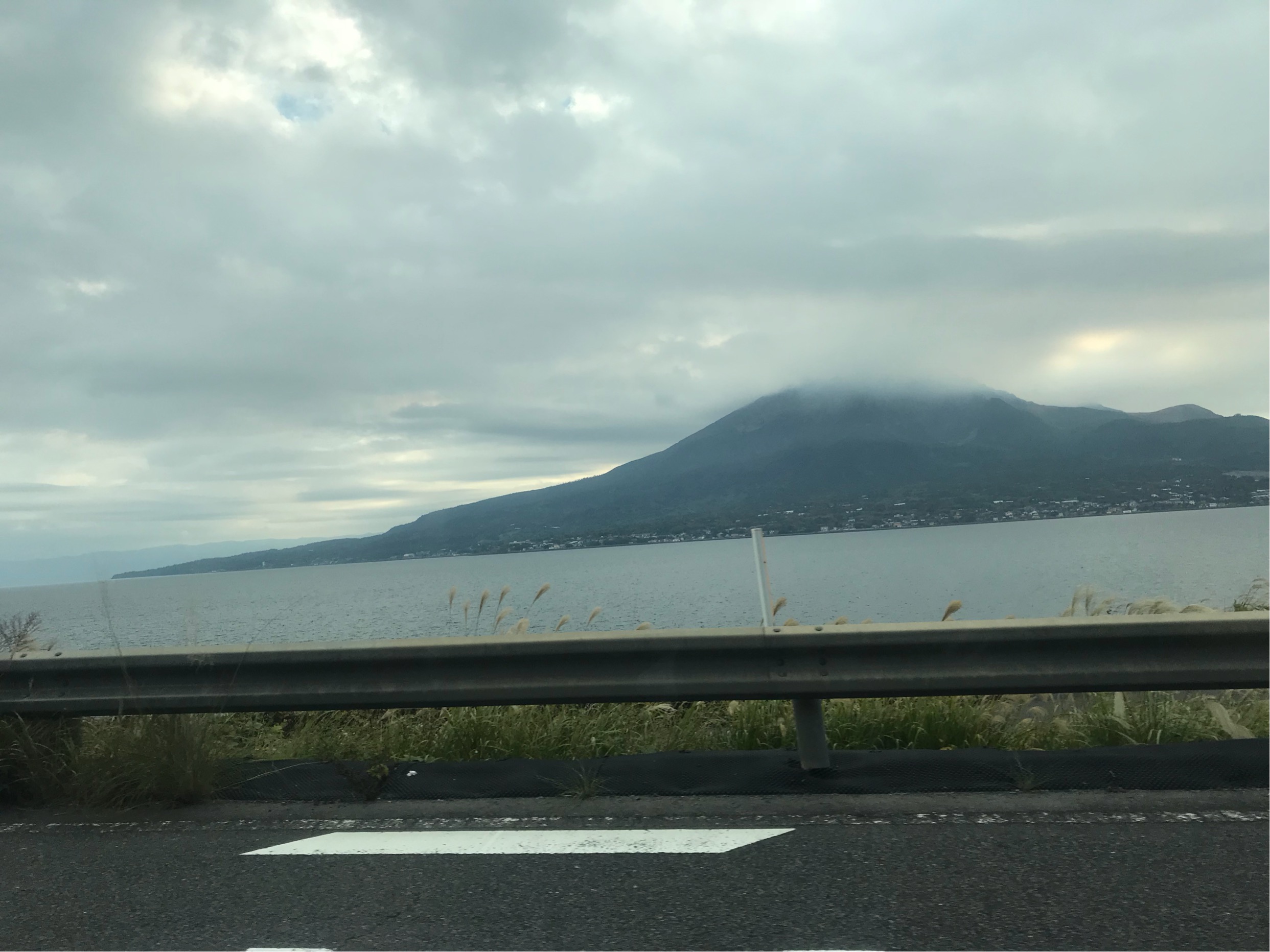 登山口へ向かう途中で桜島。頂上は雲で隠れています。