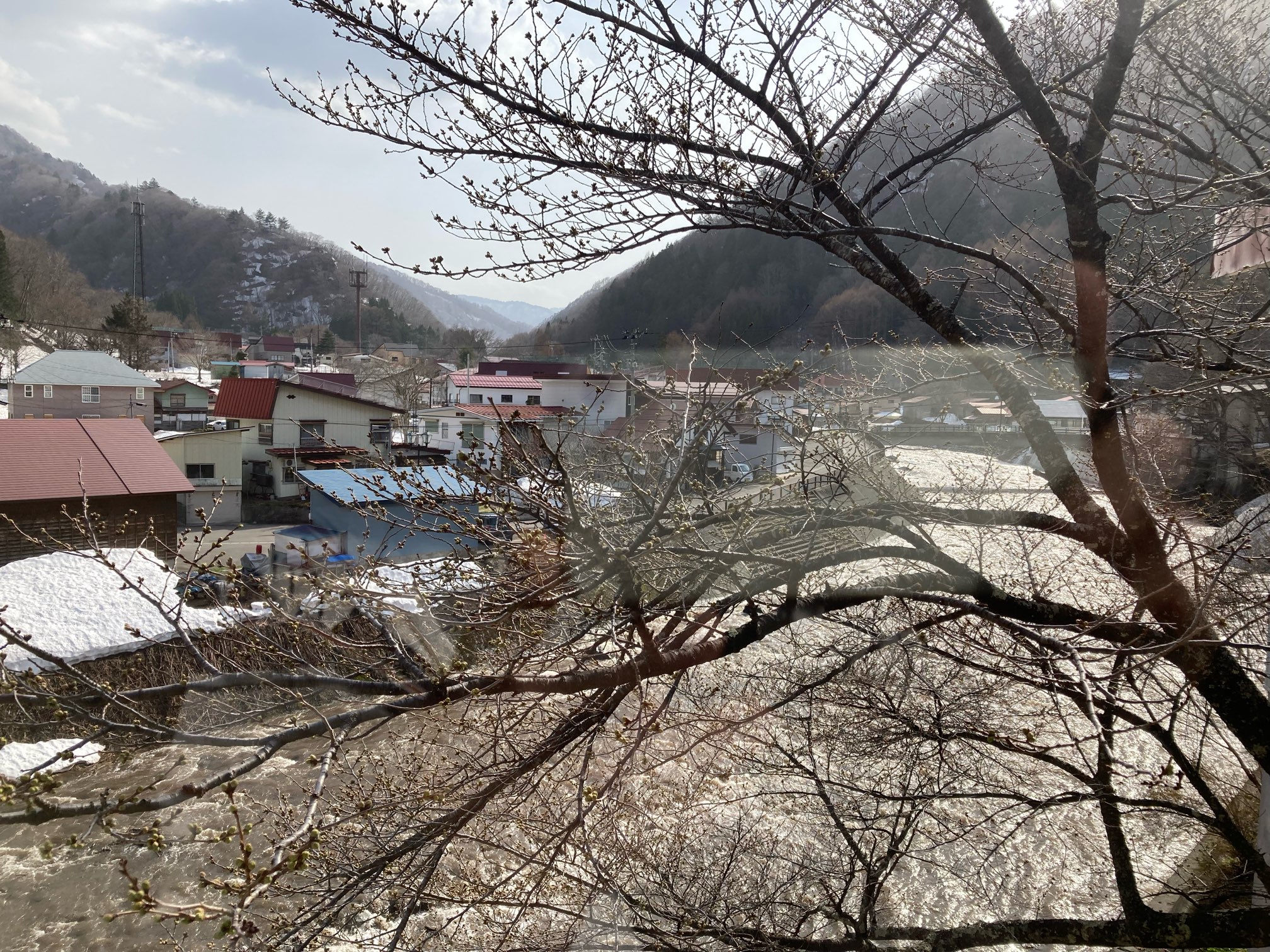 部屋からの眺め。すぐ下に檜枝岐川が音をたてて流れている。窓の外には桜の木が、あと少しで開花するよう。