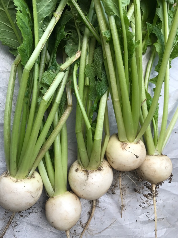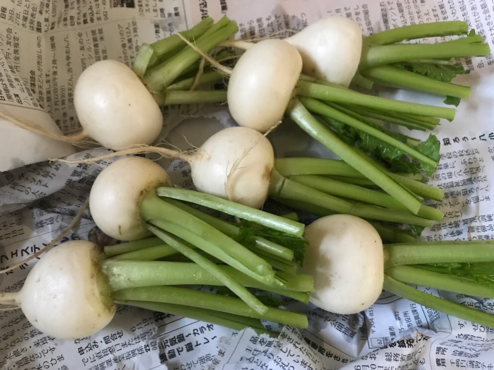 畑の片隅でチョロッと栽培していた小カブが早くも収穫に至りました。さすがにこの時季のものは成長が早く、種蒔きからわずか43日目での収穫です。