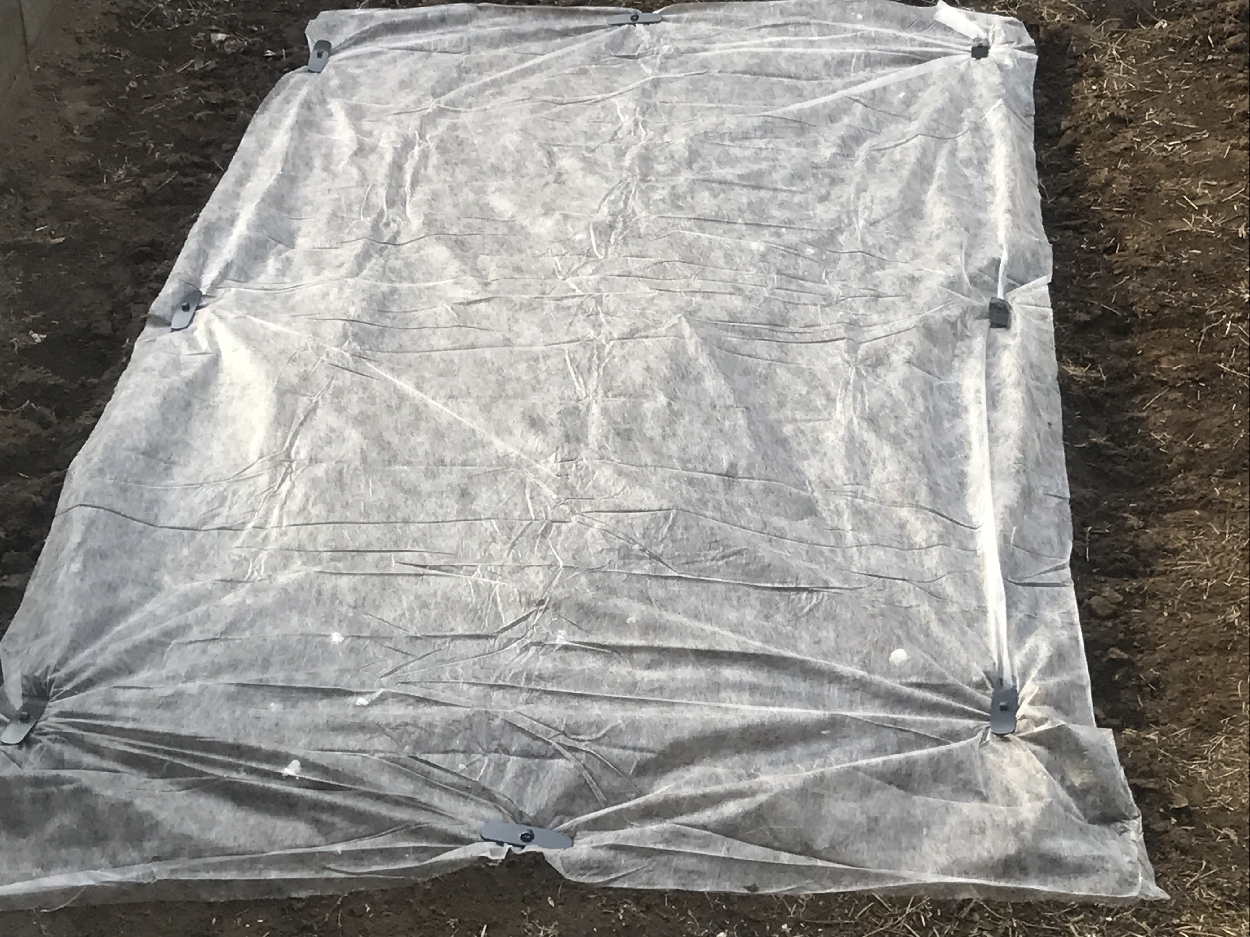 毎年、枝豆は発芽直後に憎きハト野郎に芽を喰い荒らされてしまうので、今年はその対策として不織布をベタ掛けしてます。これで憎きハト野郎も手が出せないでしょう。ざま~見ろっ!
