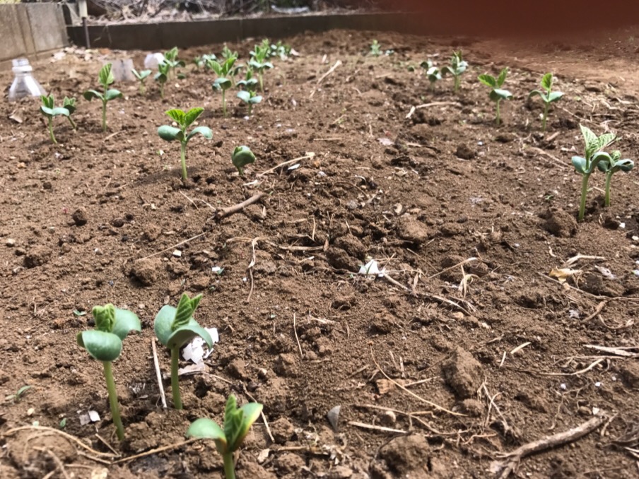 枝豆は双葉が開いたので不織布を外しました。おかげで憎きハトの被害を受けずに済みました。