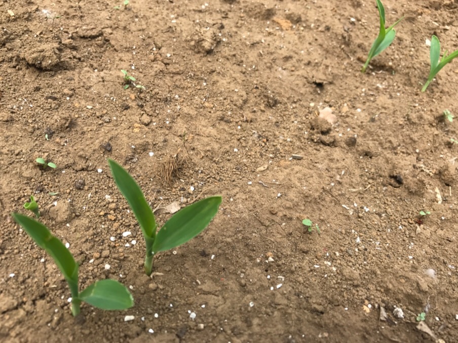 トウモロコシは3cmくらいになりました。発芽率もまずまずです。