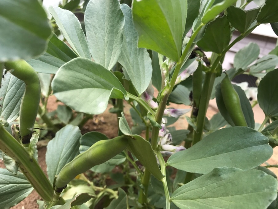 最後にそら豆です。現在、花を咲かせてますが、早いものは実を付け始めました。