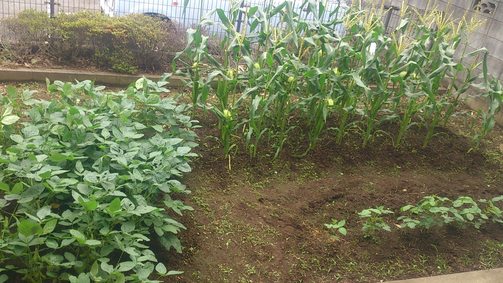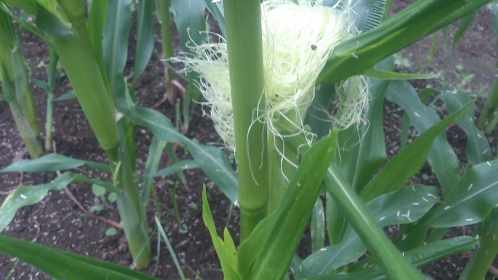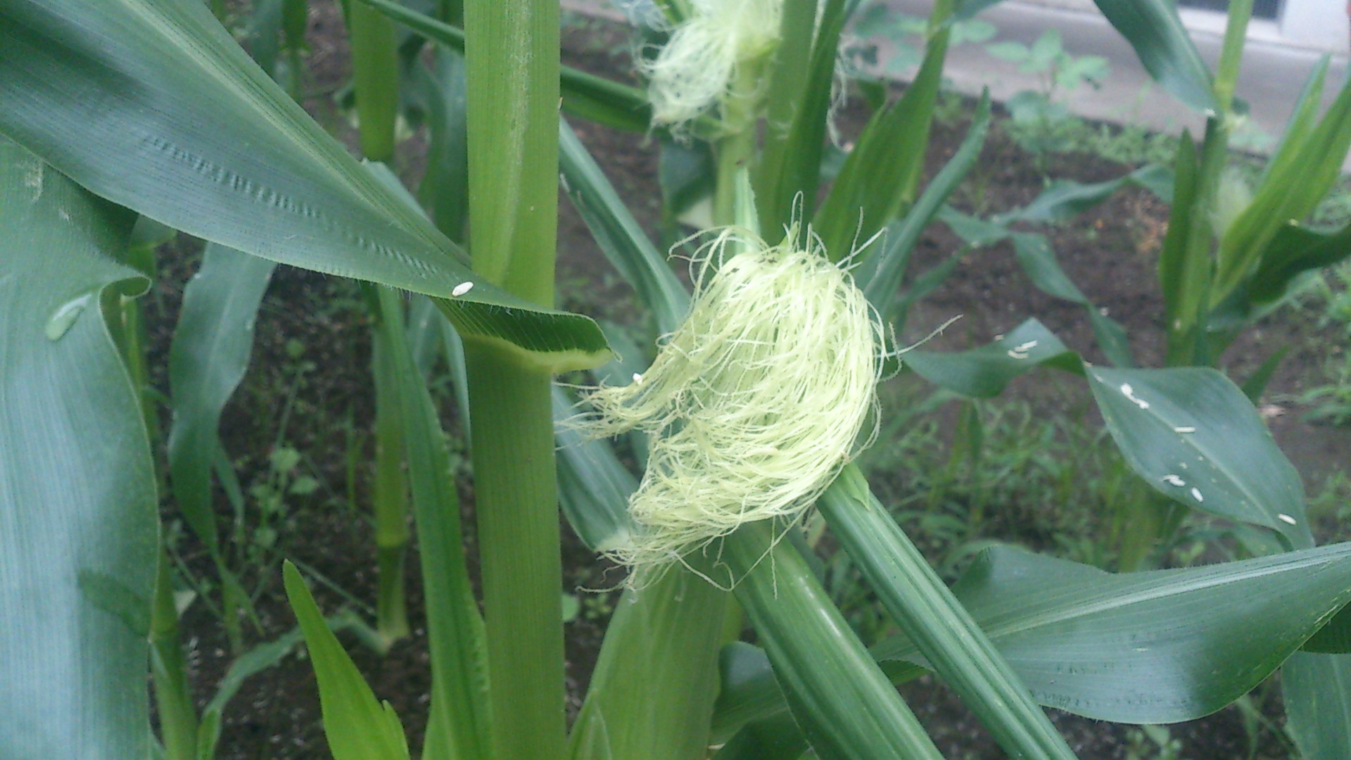 3日前に旅行から帰ってきたら、とうもろこしの雌穂が出ていました。全体の半分くらいの株です。