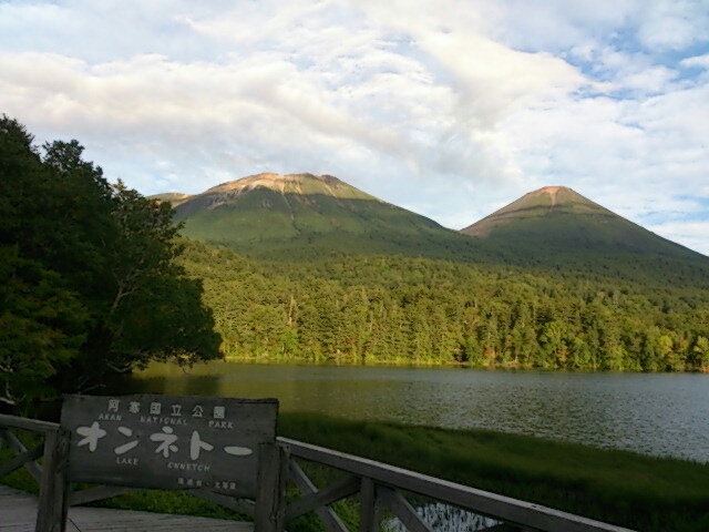 下山してオンネトーに寄ってみました。右の山がさっきまでいた阿寒富士。左が雌阿寒岳です。オンネトーは何度も見てるのですが、こんなにクッキリ山が見えたのは初めてです。山頂ではあんなだったのに。