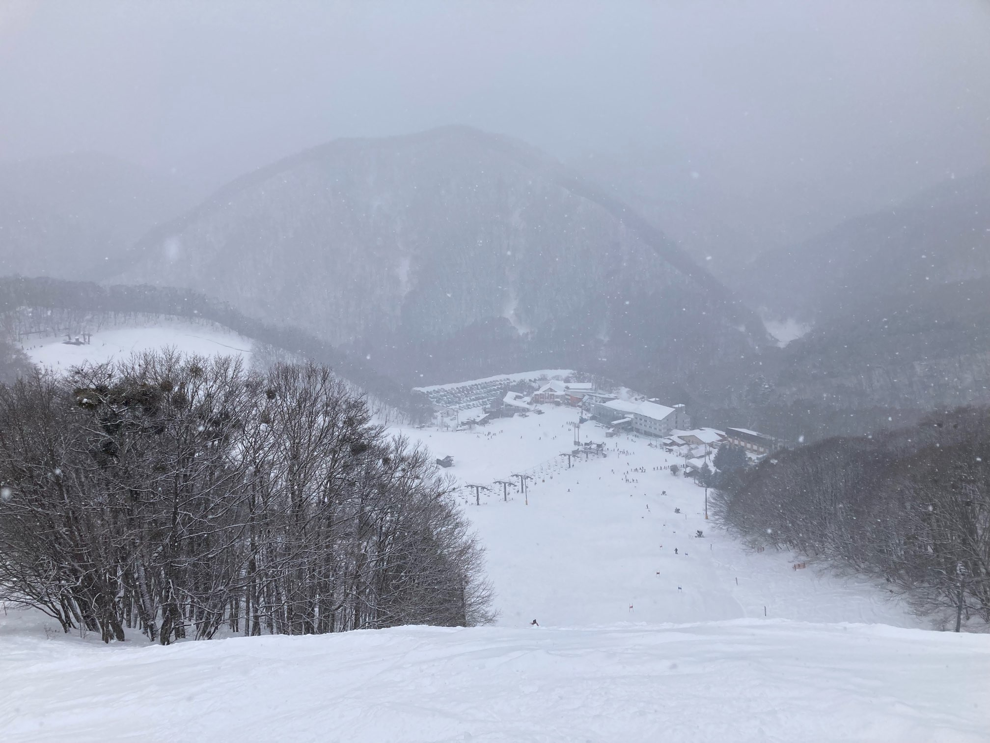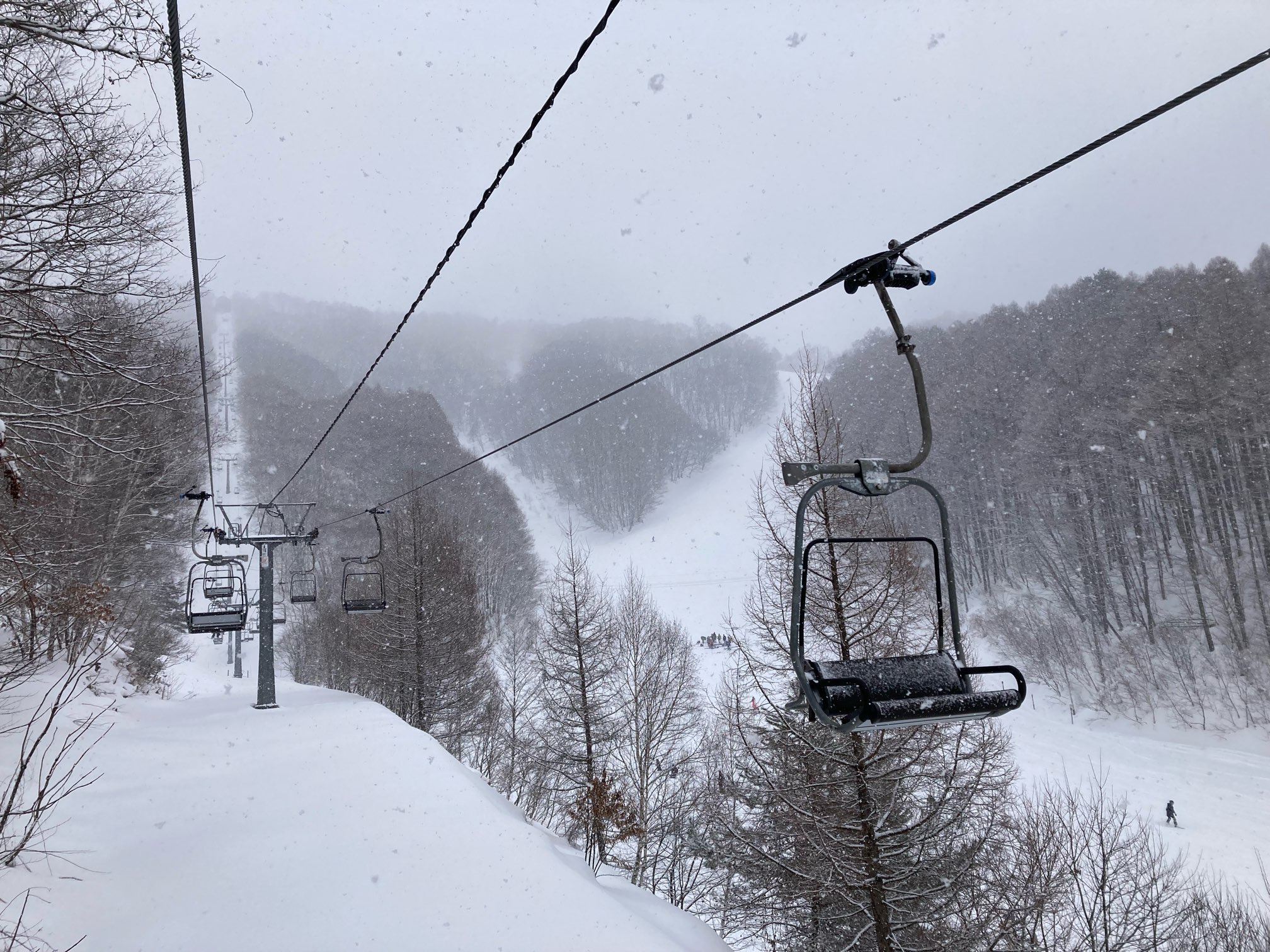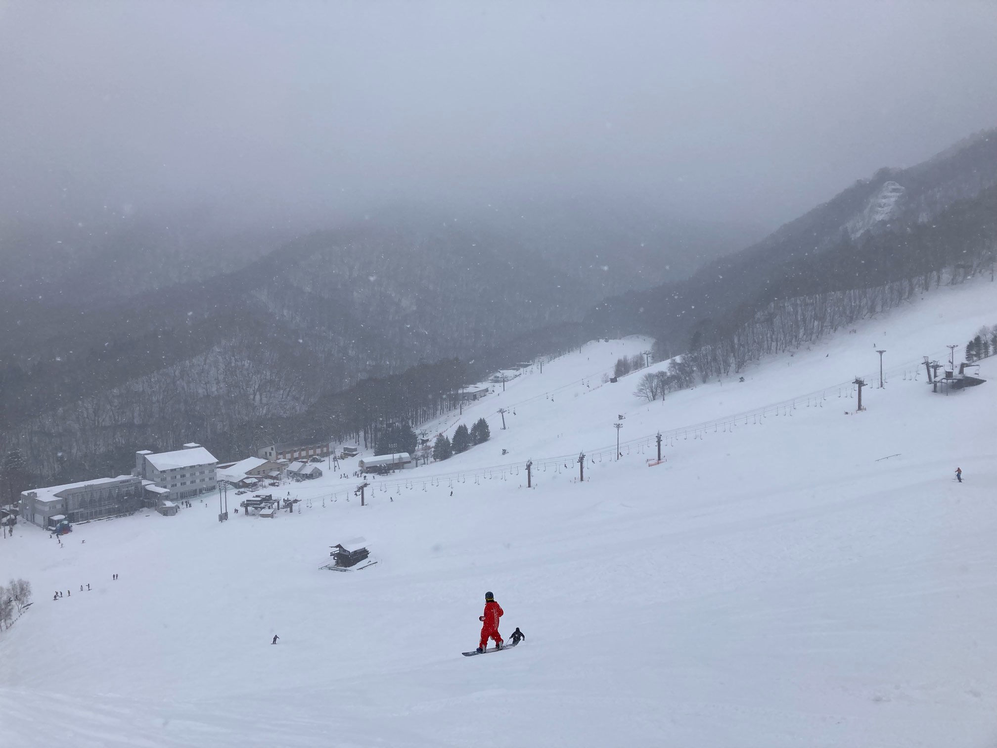 リフト数本乗ったところで雪が降ってきた。とりあえず最上部まで上がったが、もう真っ白でまったく眺望なしである。