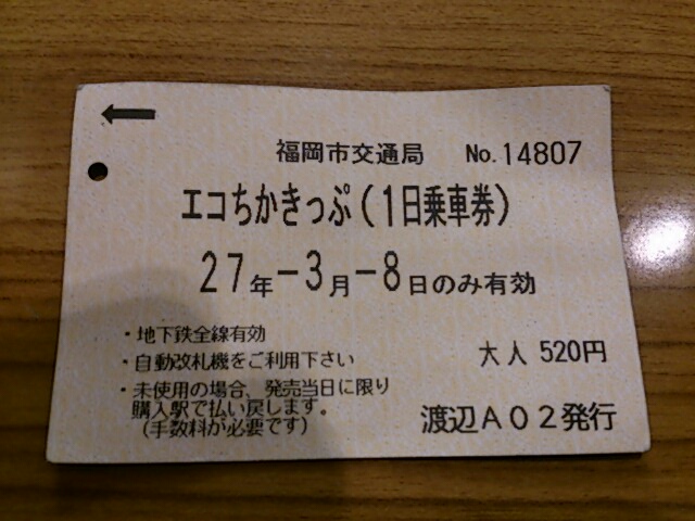 レンタカーを利用しないときは、福岡では地下鉄に乗ります。そんなときは、フリーパスが大変便利でお得です。今日1日でかなり地下鉄に乗 りましたので。