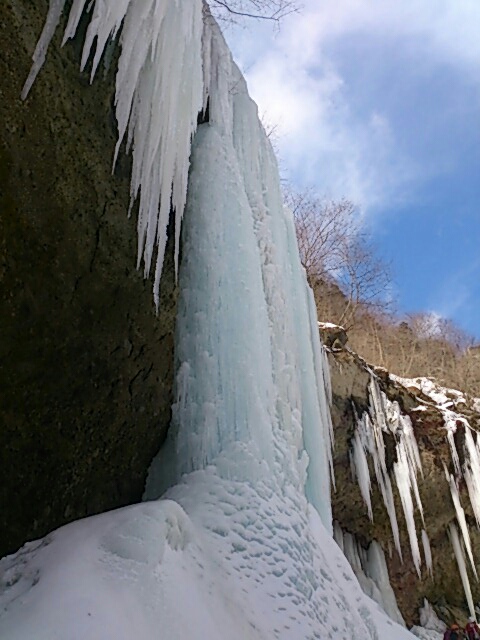 好天は良いのですが、気温が高く、溶け落ちたツララが頭上から落ちてきます。しばらく眺めたあとに撤退しました。