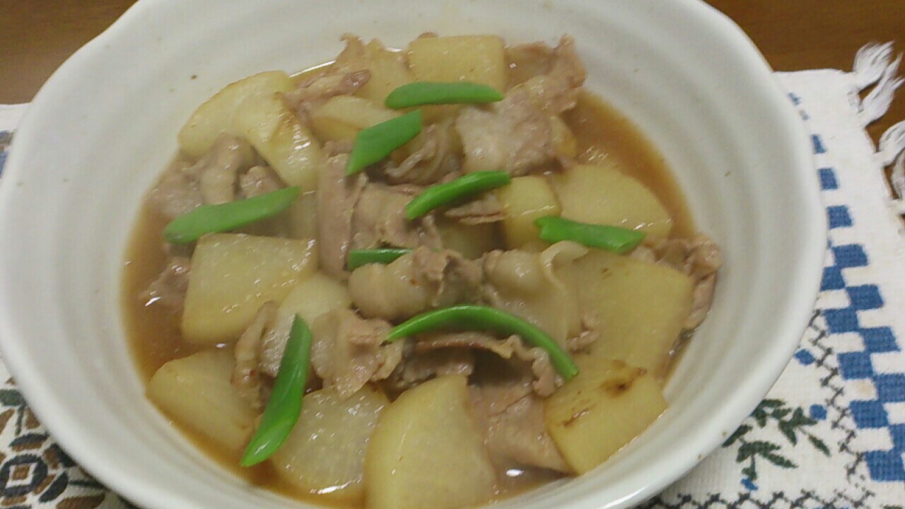 今日のメインは大根です。その大根と豚バラで甘辛旨煮を作ってみました。上に乗っけているのは、我が家で採れたモロッコいんげんです。