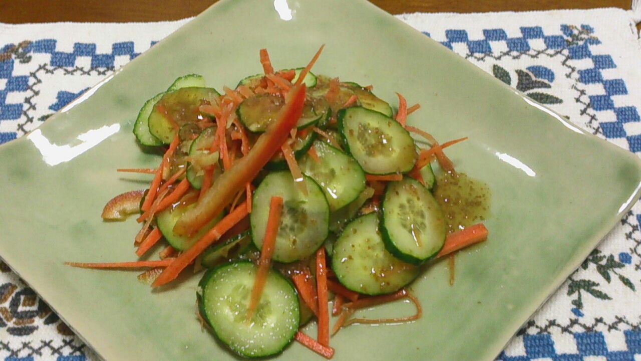 さらにもう一品。ニンジン、パプリカ、きゅうりでサラダを作りました。