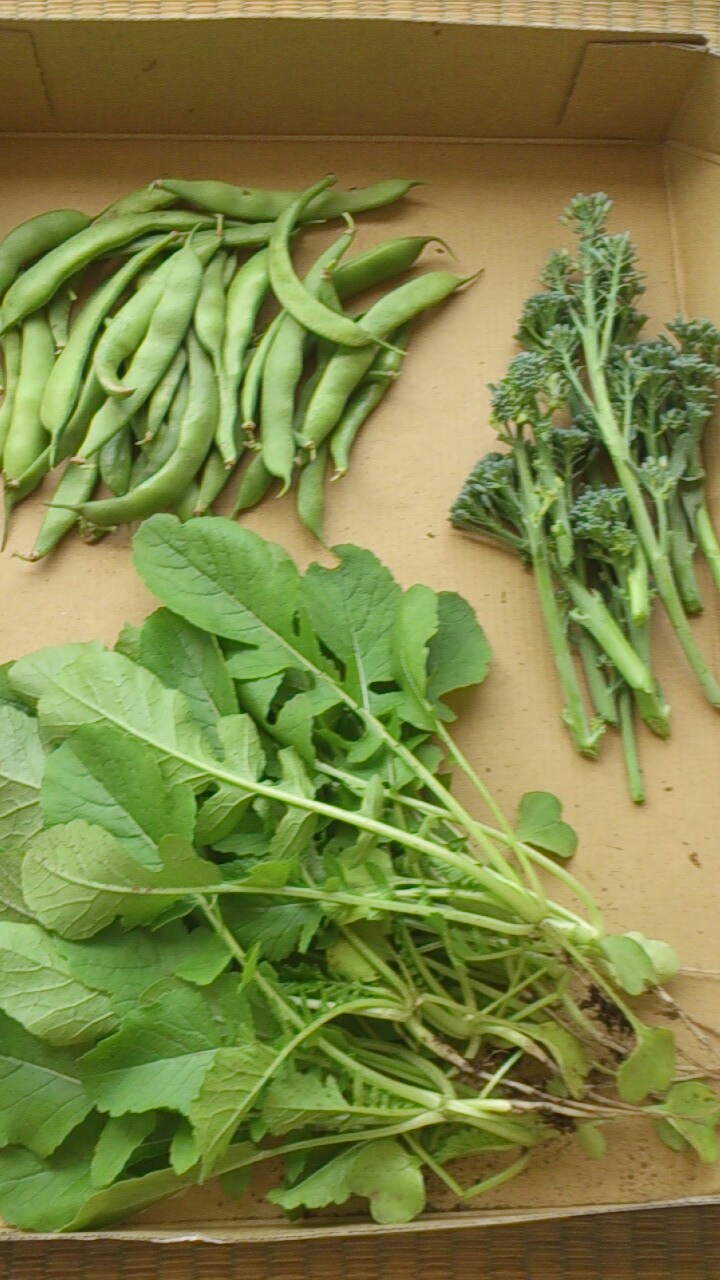 今日はスティックブロッコリー、モロッコいんげん、それから初めて葉だいこんをとりました。