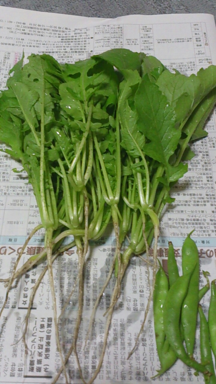 庭の畑はそろそろ仕舞いが近づいてきたかな?モロッコいんげんの残りを取ってこれで撤収です。それから葉だいこんを収穫しました。