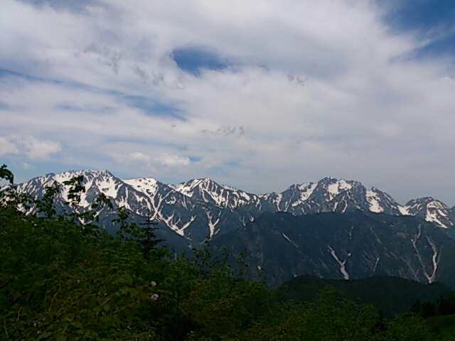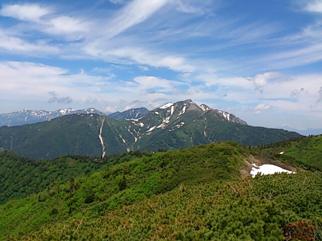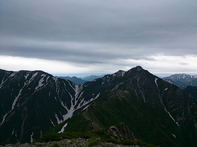 しばらく登ると針ノ木岳、ズバリ岳、赤沢岳が姿を現しました。これらは明日、登頂します。