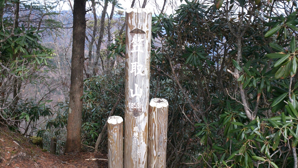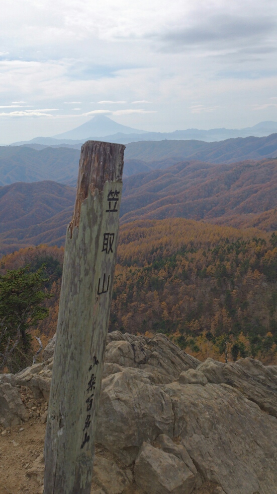というわけで2時間15分で、笠取山西峰に到着しました。多少雲が出ていますが、まずまずの眺めです。まぁ良しとしましょう。