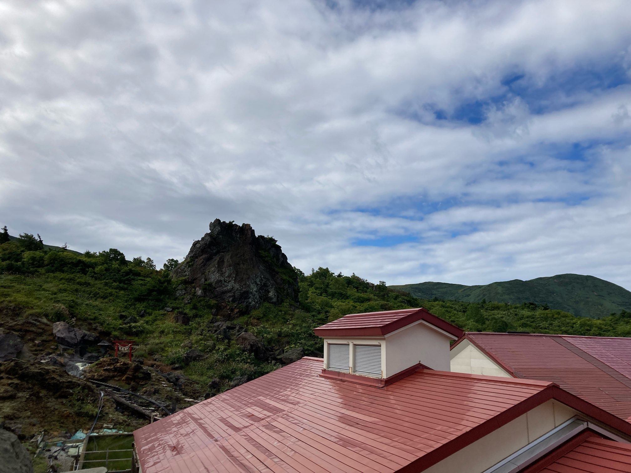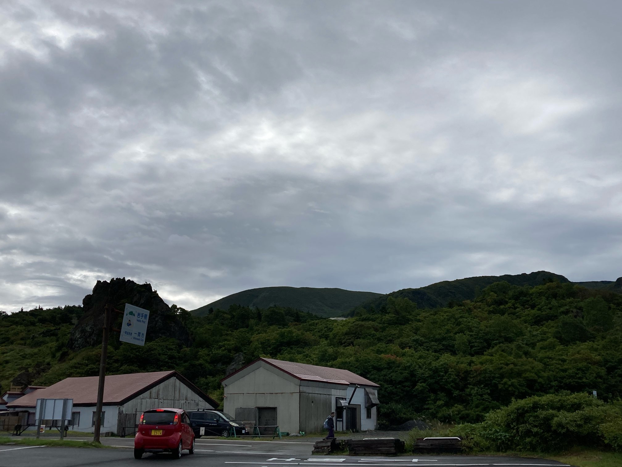 風呂上がりに宿前からは栗駒山が見えた。露天風呂から眺めていたら、栗駒山に向かう登山者が何人もいた。