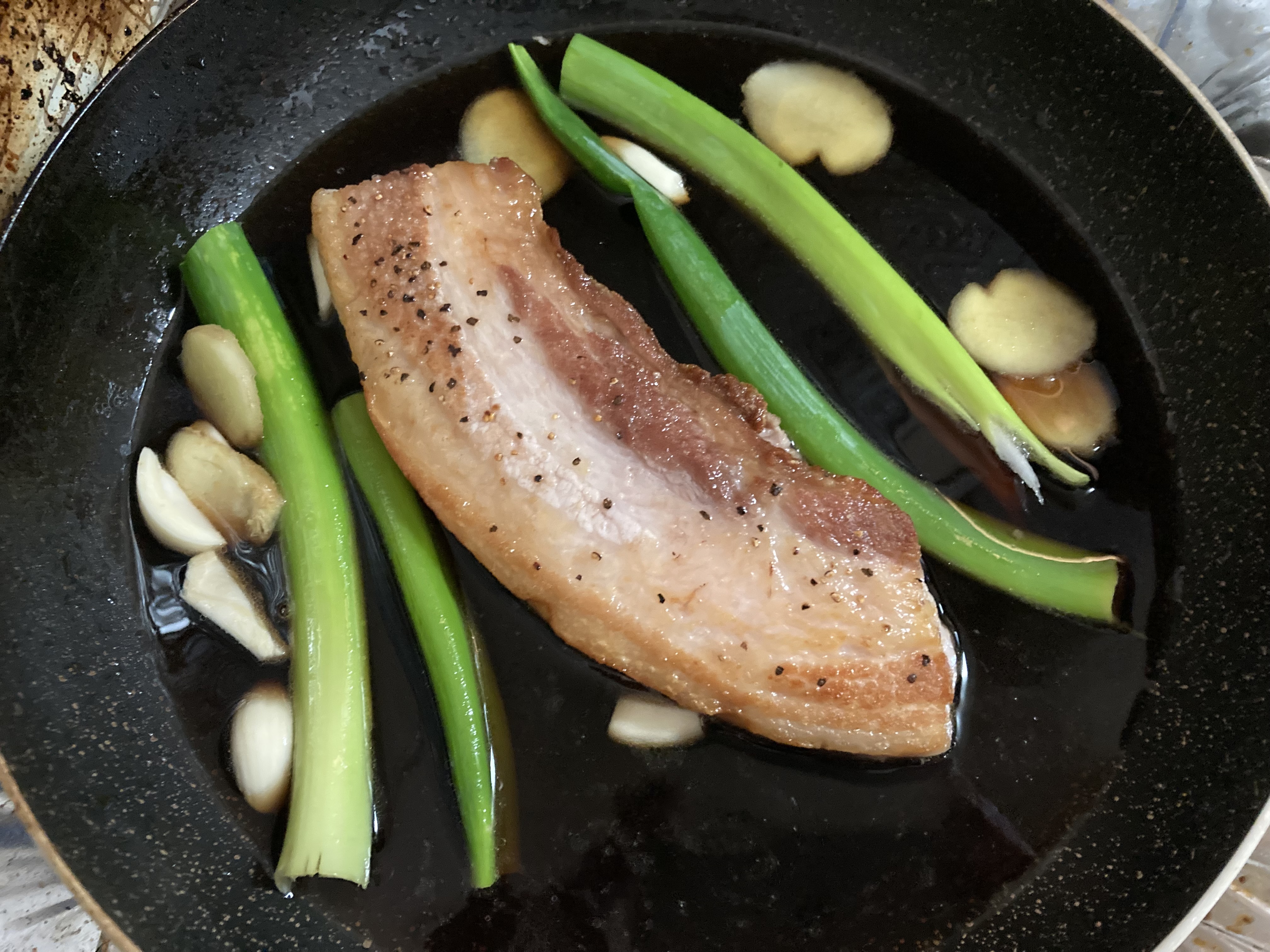 フライパンで表面を炙ったら、タレと一緒に柔らかくなるまでじっくり煮込む。