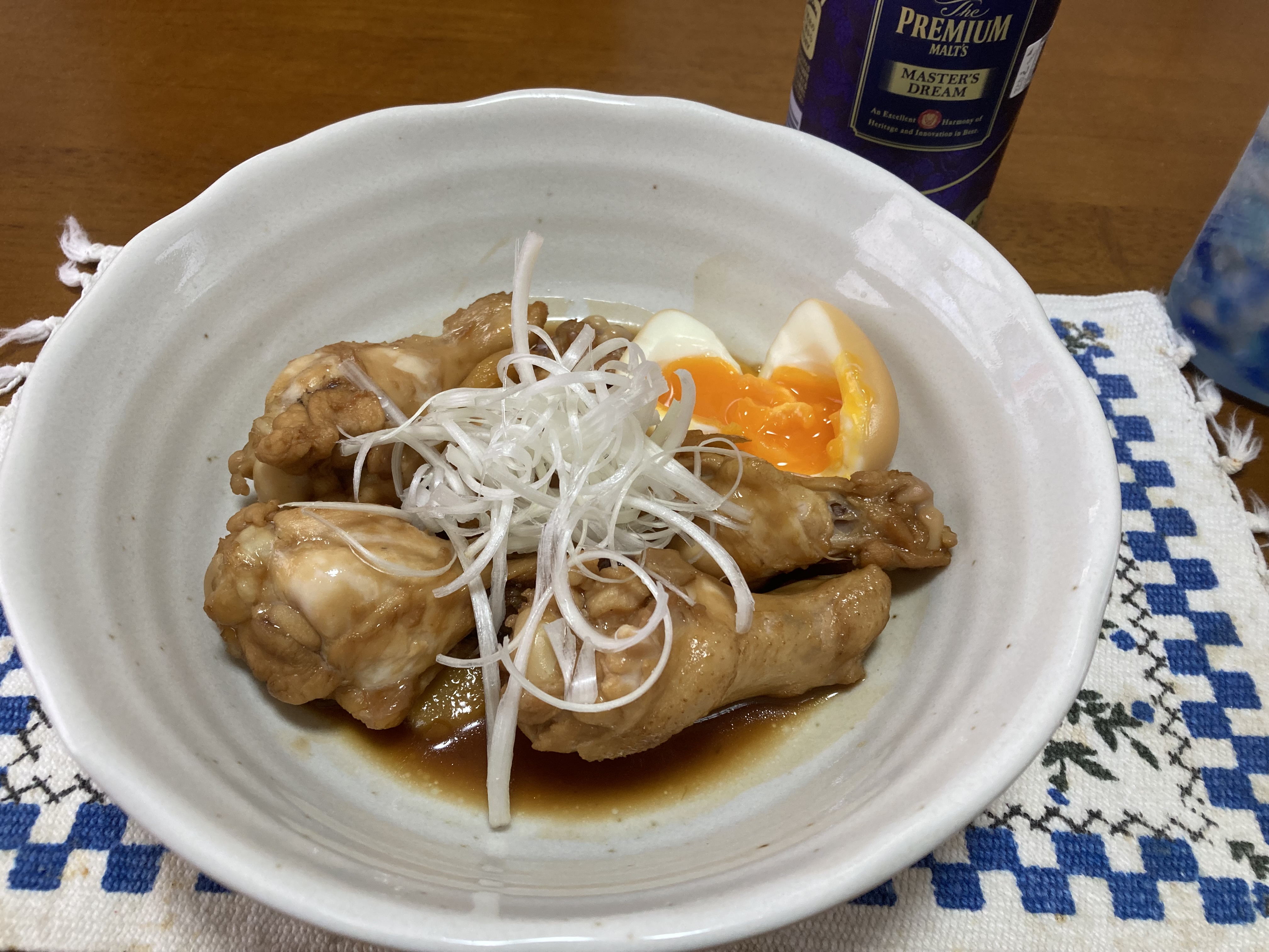 記念に昼からビール。つまみに手羽元を甘めに炊いてみた。