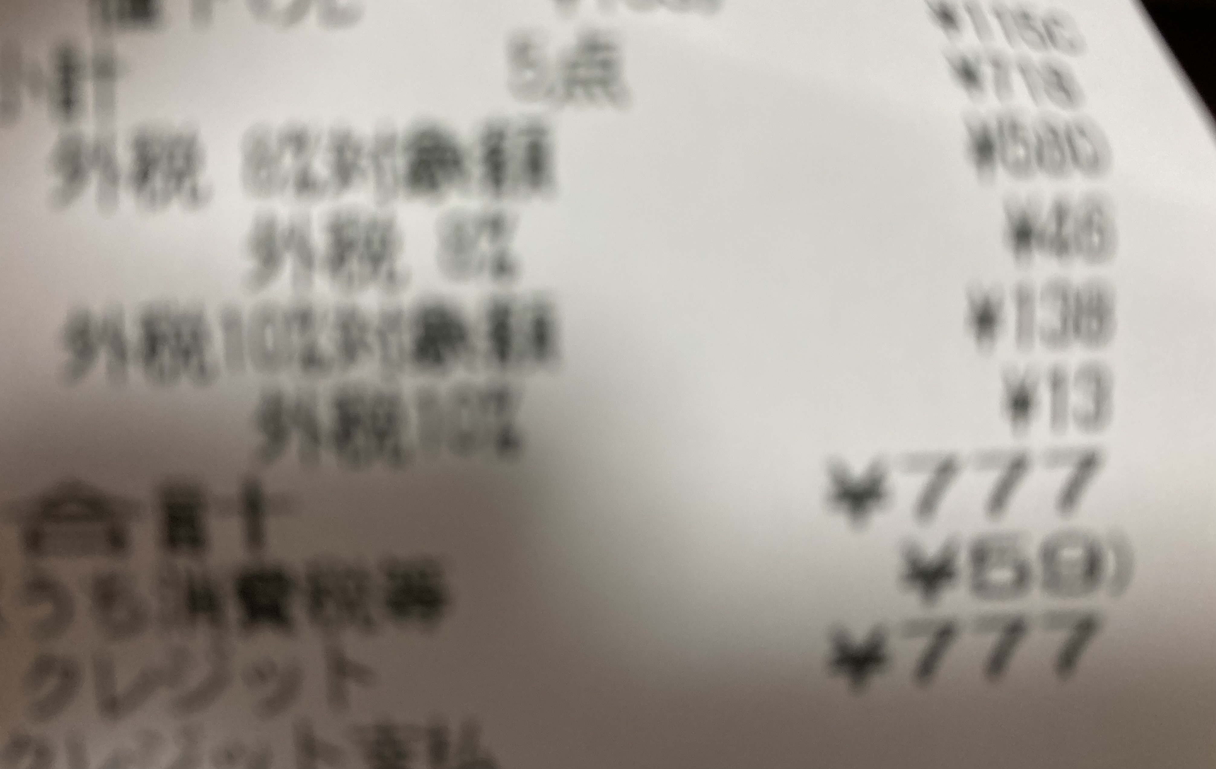 スーパーで買い物したら、合計額が777円になった。何だかラッキーで嬉しい感じであった。