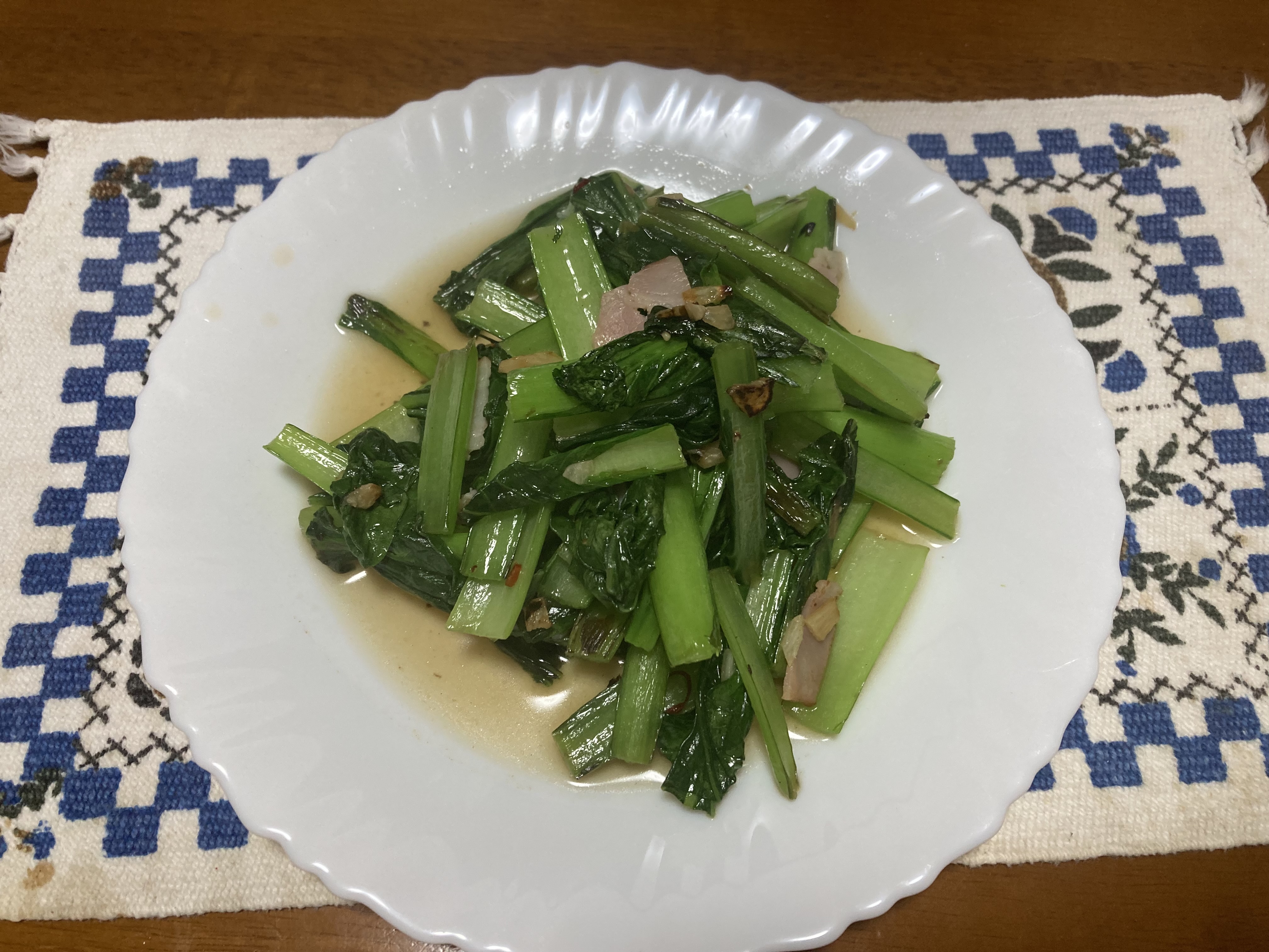 残り物の小松菜があったので、久しぶりに青菜炒めを作った。