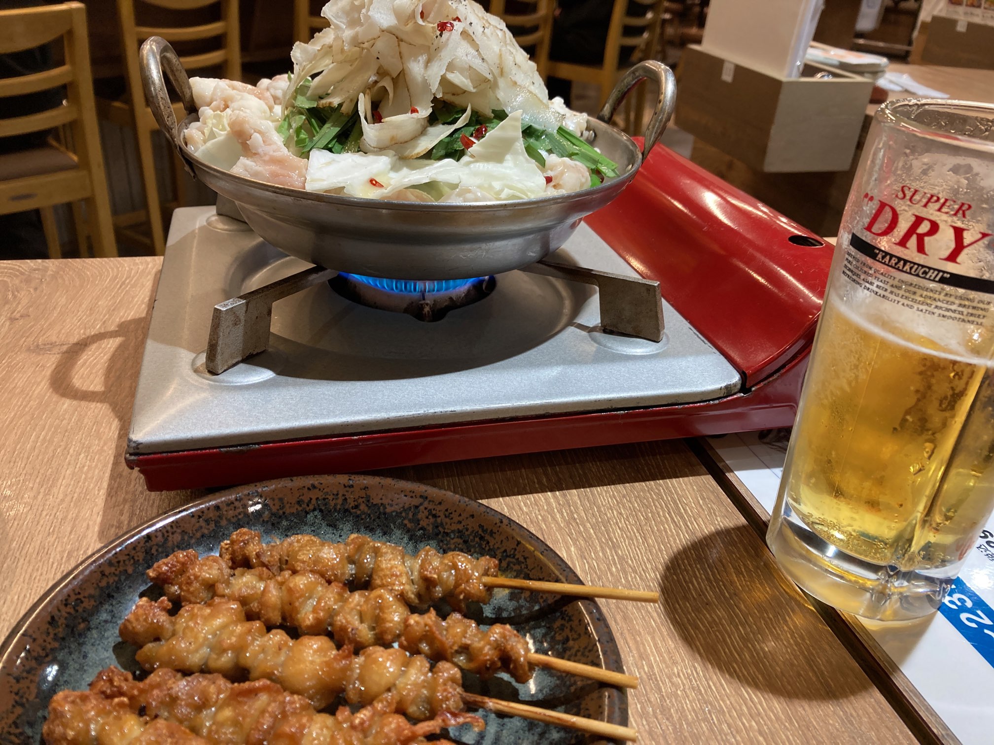 昼間からモツ鍋ビールでほろ酔い気分。