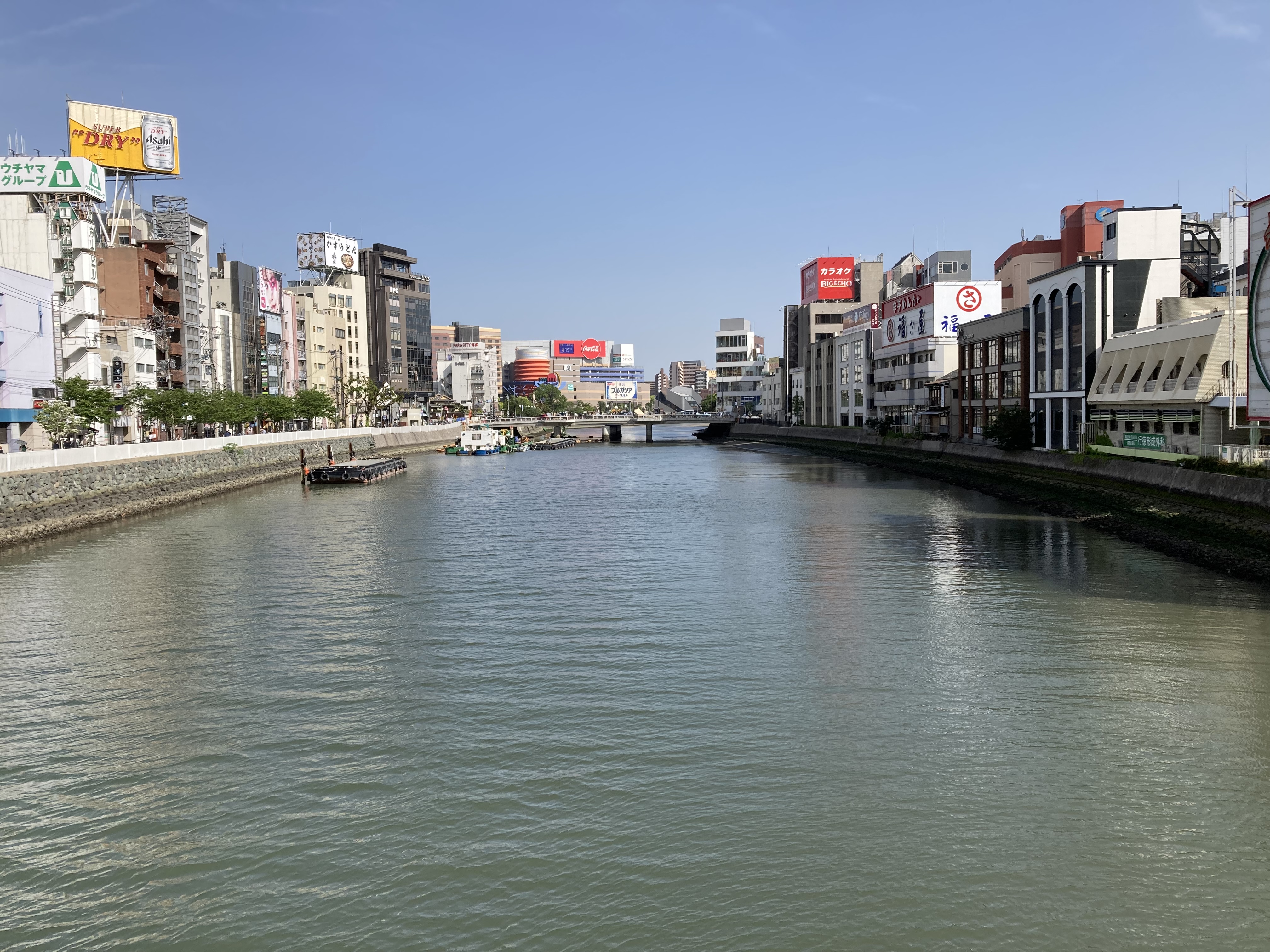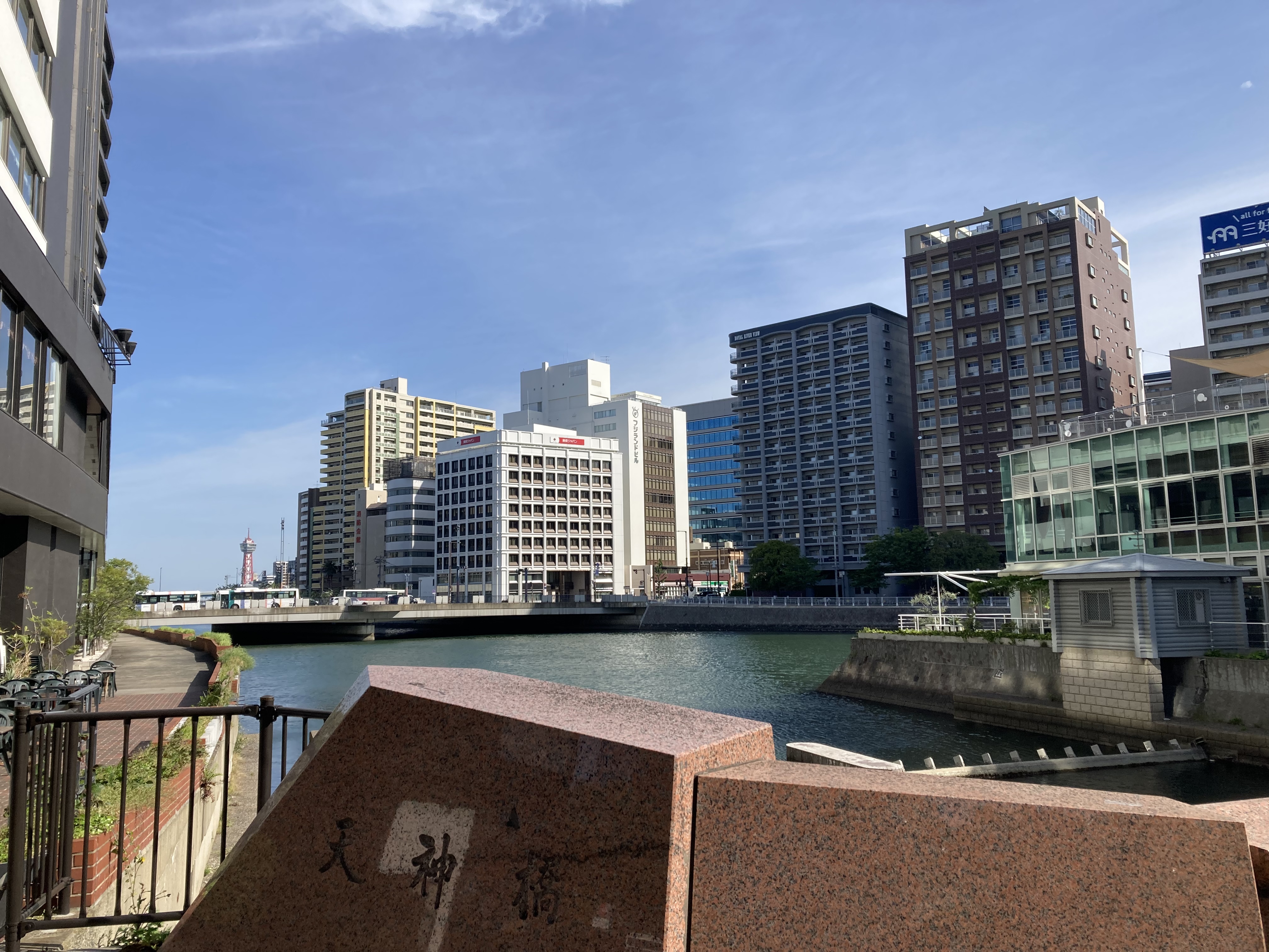 日曜日の朝はまだ人が少なく、天神周辺でも静かである。河辺の雰囲気がとても良い。