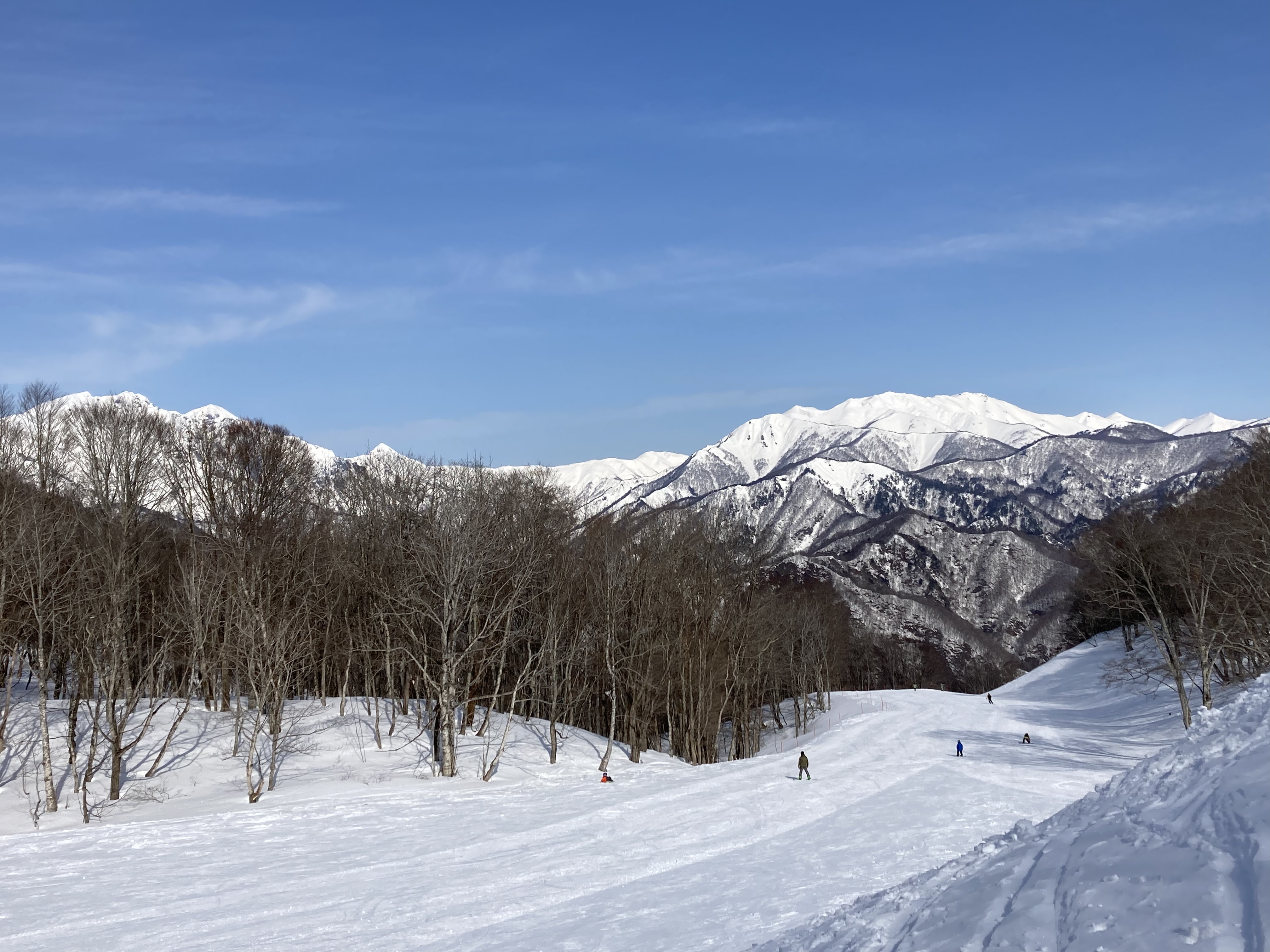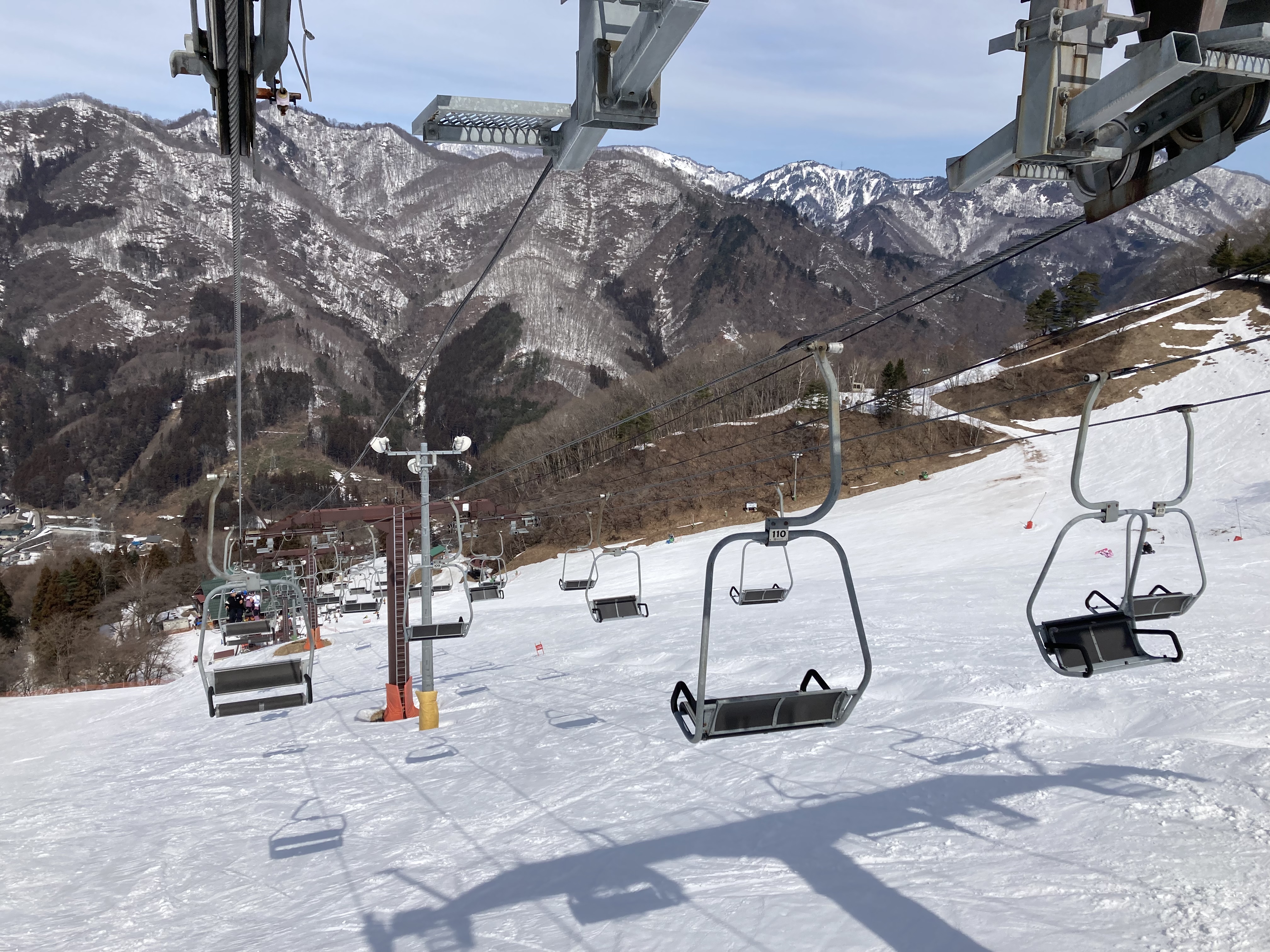 中腹から下のエリアはだいぶ雪がなくなってきている。コース上もところどころ土やブッシュが見えている箇所があった。毎年そうだが、シーズン初めはたくさん雪が降って喜んでいるが、2月の半ば過ぎればまとまった雪が降らず、一気に積雪が減っていってしまう。さらにこの陽気で春スキー本番の風情である。